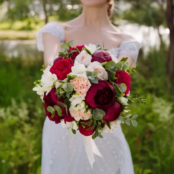 Букет невесты с красными пионами и фрезией — купить по цене от 9270 руб. с доставкой в Нижнем Новгороде