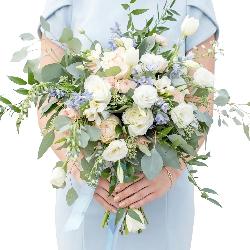 Дельфиниум Голубой - 7 шт. Роза Розовая (30 см.) - 9 шт. Роза Кустовая Пионовидная Нежно-Розовая (50 см.) - 5 шт. Тюльпан Белый - 5 шт. Фрезия Белая - 3 шт. Лизиантус Белый - 3 шт. Рускус Лонг - 0.5 шт. Эвкалипт Populus Лента атласная