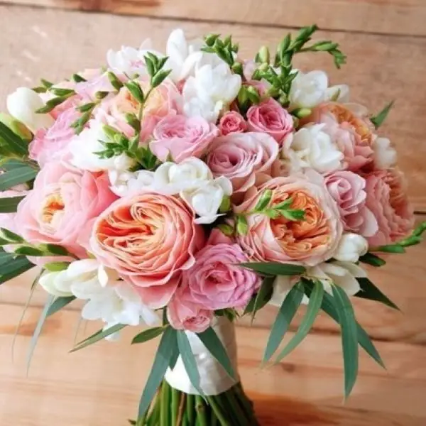 Букет невесты с пионовидными розами и фрезией — отличный выбор для дополнения очаровательного образа! На сайте "Букет-НН" Вы найдете свадебные букеты выполненные в разных техниках и стилях. Цена данного букета —9220 руб., а в его состав входят:Роза Пинк Охара (50 см.) - 7 шт., Роза Кустовая Пионовидная Розовая (50 см.) - 5 шт., Фрезия Белая - 15 шт., Эвкалипт Parvifolia, Лента атласная. Закажите Букет невесты с пионовидными розами и фрезией с доставкой Нижнем Новгороде и по области