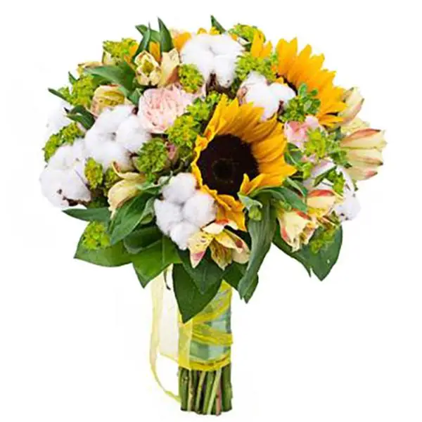 Букет невесты с подсолнухами и хлопком — отличный выбор для дополнения очаровательного образа! На сайте "Букет-НН" Вы найдете свадебные букеты выполненные в разных техниках и стилях. Цена данного букета —4160 руб., а в его состав входят:Альстромерия — 5 шт. , Хлопок — 7 шт. , Буплерум — 5 шт. , Подсолнух — 3 шт. , Роза кустовая нежно-розовая «Лидия»  — 4 шт. , Зелень. Закажите Букет невесты с подсолнухами и хлопком с доставкой Нижнем Новгороде и по области