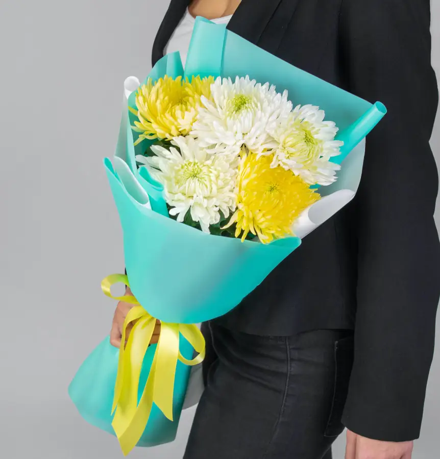 На фото - 5 Бело-Желтых Игольчатых Хризантем. В составе данной композиции: Хризантема одноголовая - 5 шт, Дизайнерская упаковка, Лента атласная, . На сайте "Букет-НН" Вы найдете большой выбор недорогих букетов, цветочных композиций для любого повода. У нас можно заказать 5 Бело-Желтых Игольчатых Хризантем за 3000 руб.
