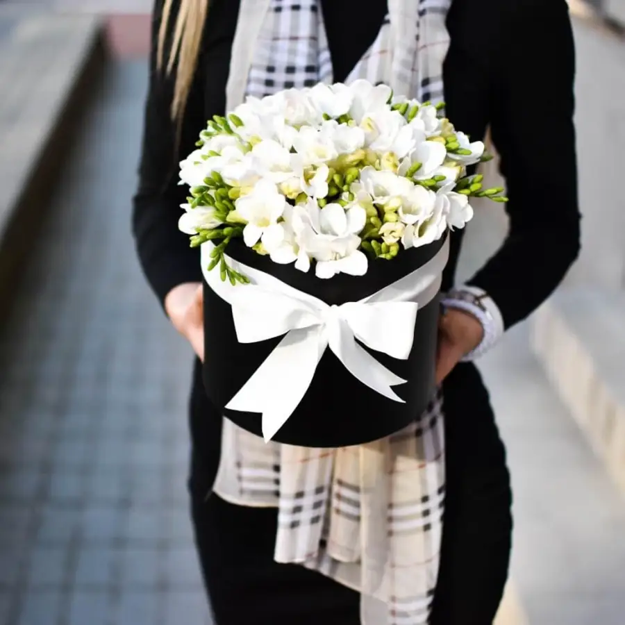 На фото - 25 Фрезий в коробке . В составе данной композиции: Фрезия - 25 шт, Шляпная коробка, Флористическая губка, Лента атласная. На сайте sbuket-nn.ru Вы найдете большой выбор недорогих букетов, цветочных композиций и корзин цветов для любого повода. У нас можно заказать 25 Фрезий в коробке за 6925 руб. с доставкой Нижнем Новгороде и по области
