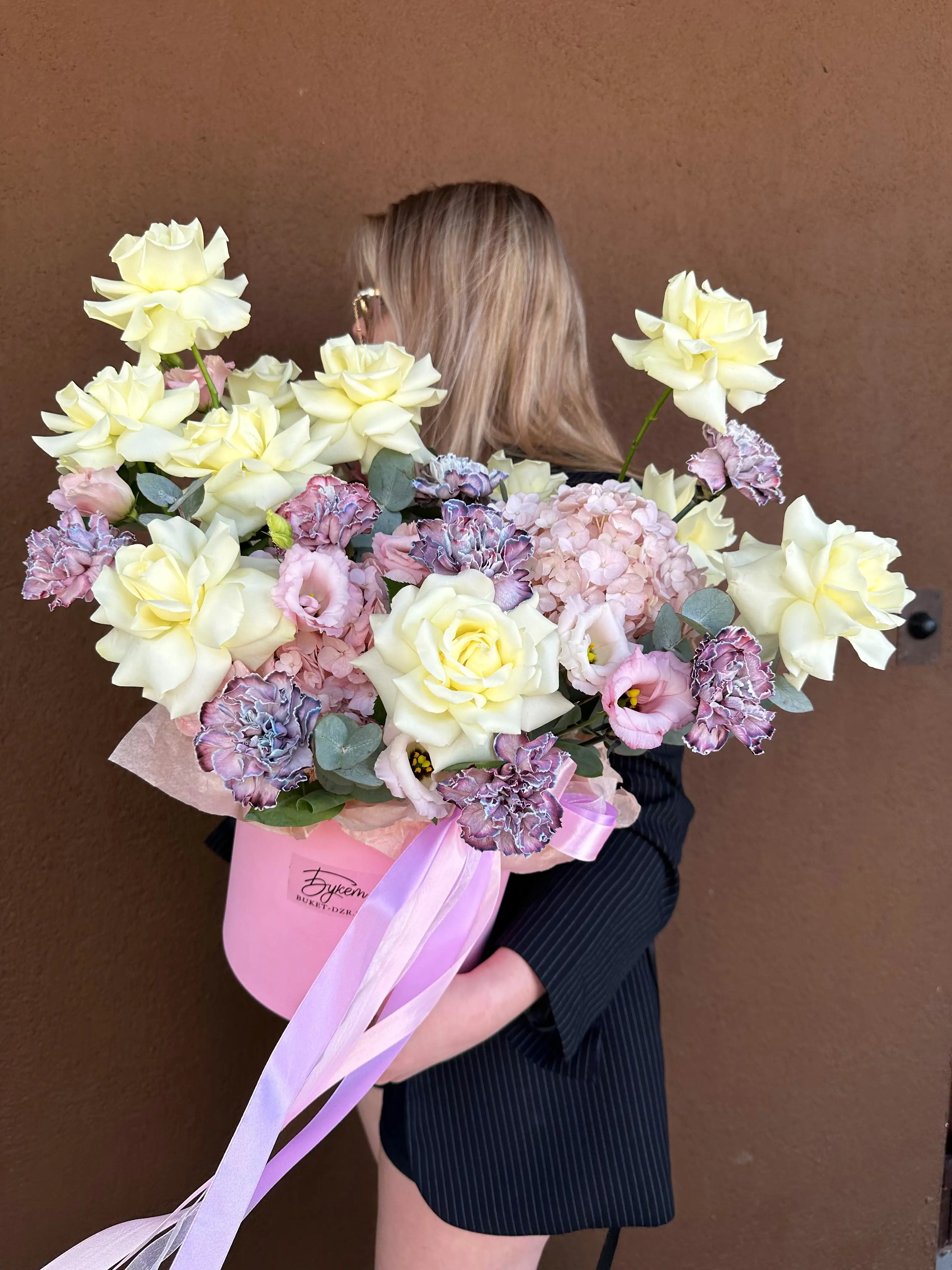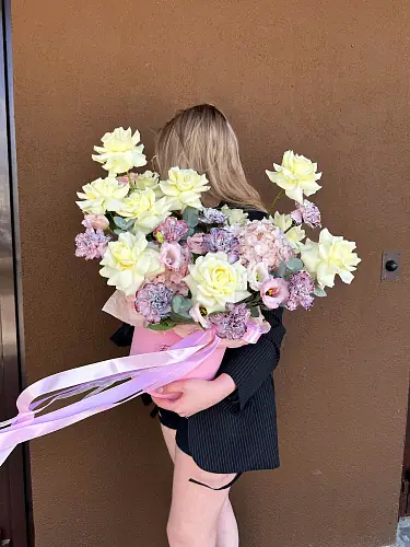 Соберем в день доставки, только из свежих цветов и затем с улыбкой вручим получателю.