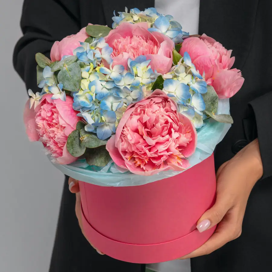 Коробка с гортензией и розовыми пионами