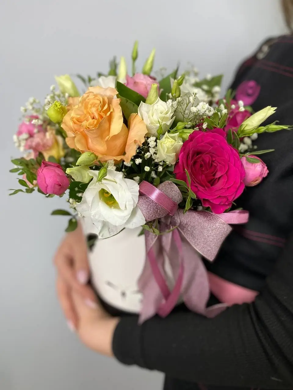 Шляпная коробка с цветами “Без повода” из роз и гипсофил