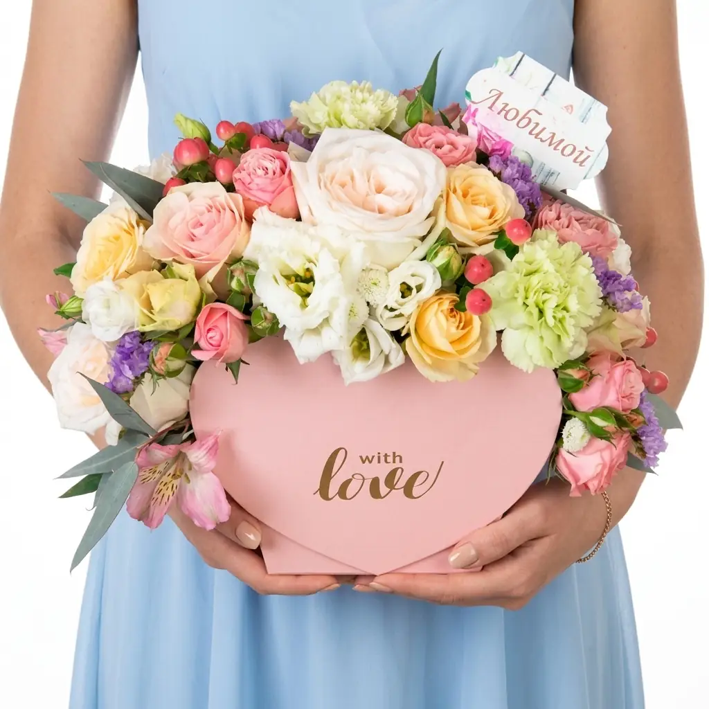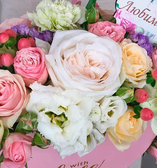 Розовая коробка в форме сердце, наполненная цветами в нежной гамме - лучшее признание в Ваших чувствах дорогому человеку. Дополните композицию топпером "Любимой" и такой цветочный презент растопит любое сердце!