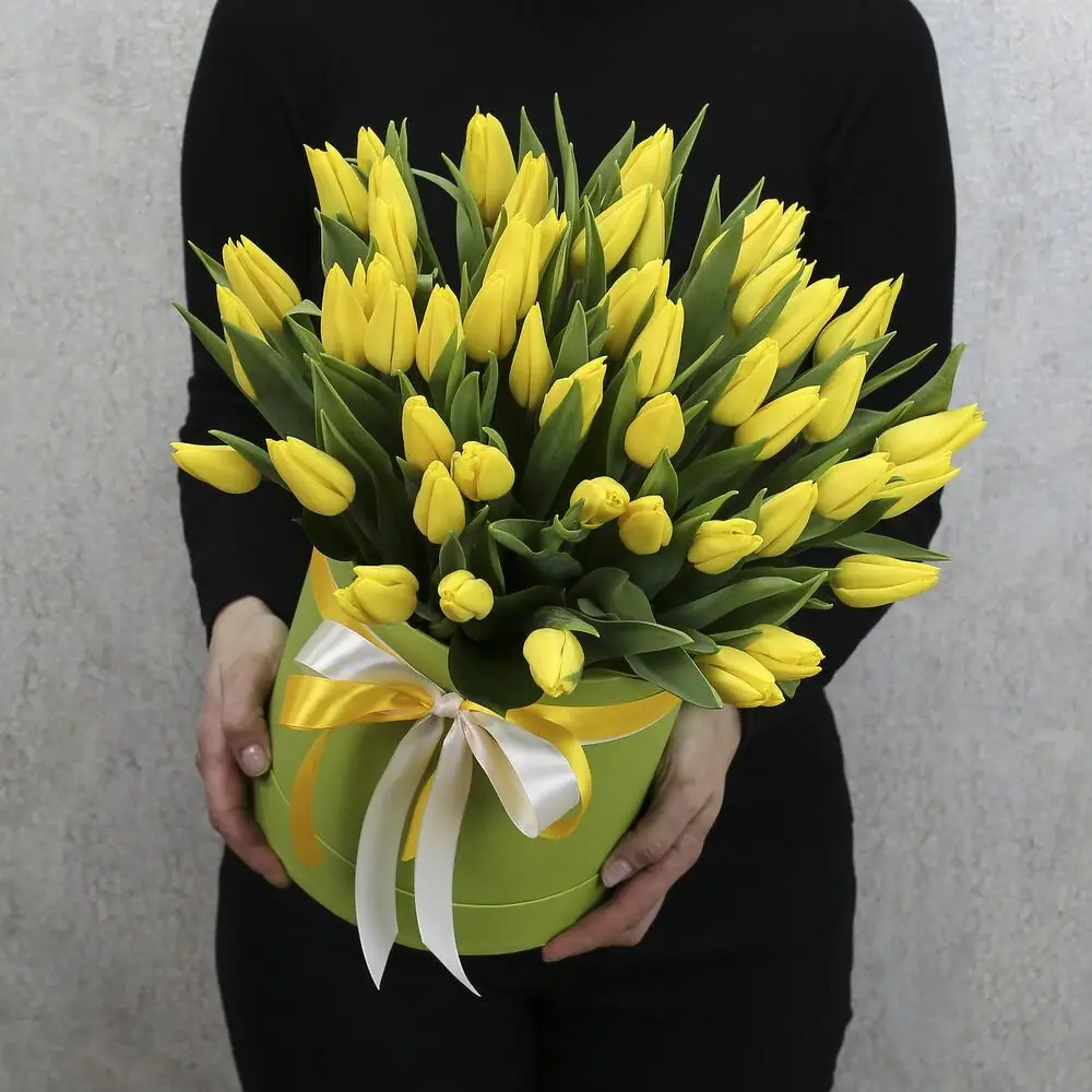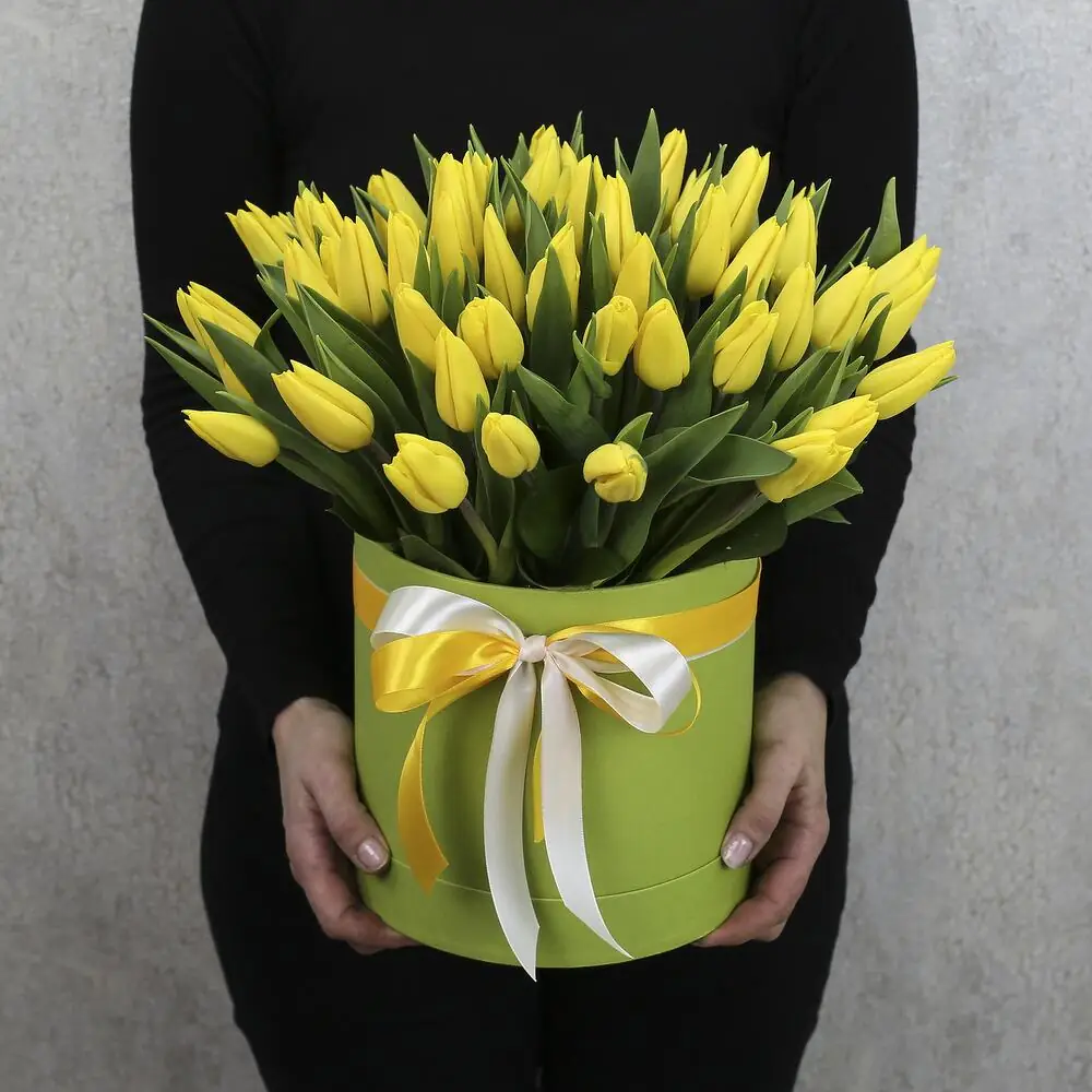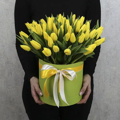 На фото - Композиция из 51 жёлтого тюльпана . В составе данной композиции: Тюльпан - 51 шт, Шляпная коробка, Лента атласная , Губка флористическая , . На сайте "Букет-НН" Вы найдете большой выбор недорогих букетов, цветочных композиций для любого повода. У нас можно заказать Композиция из 51 жёлтого тюльпана за 12910 руб.