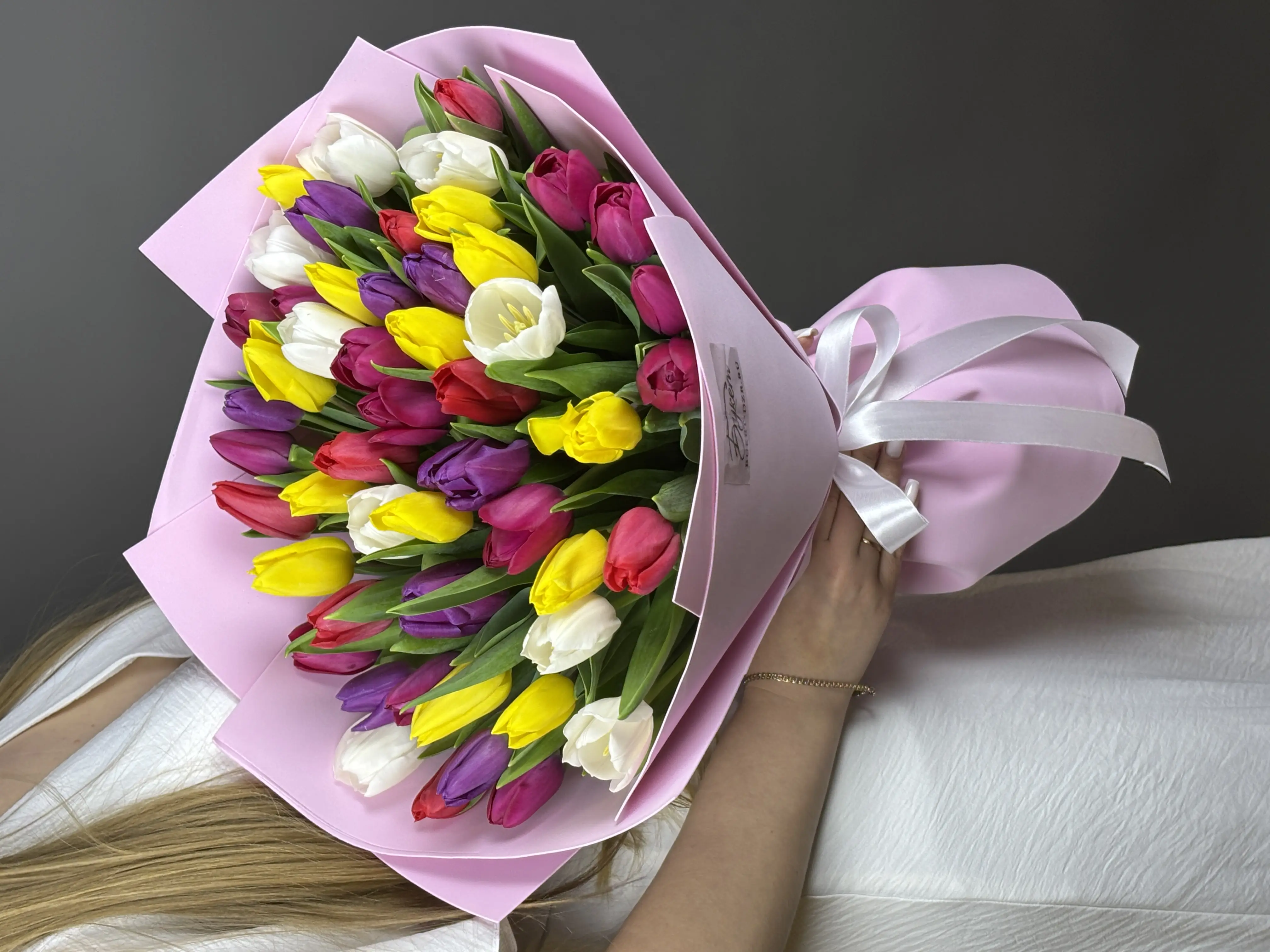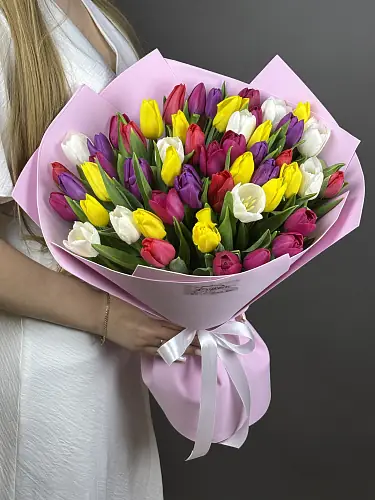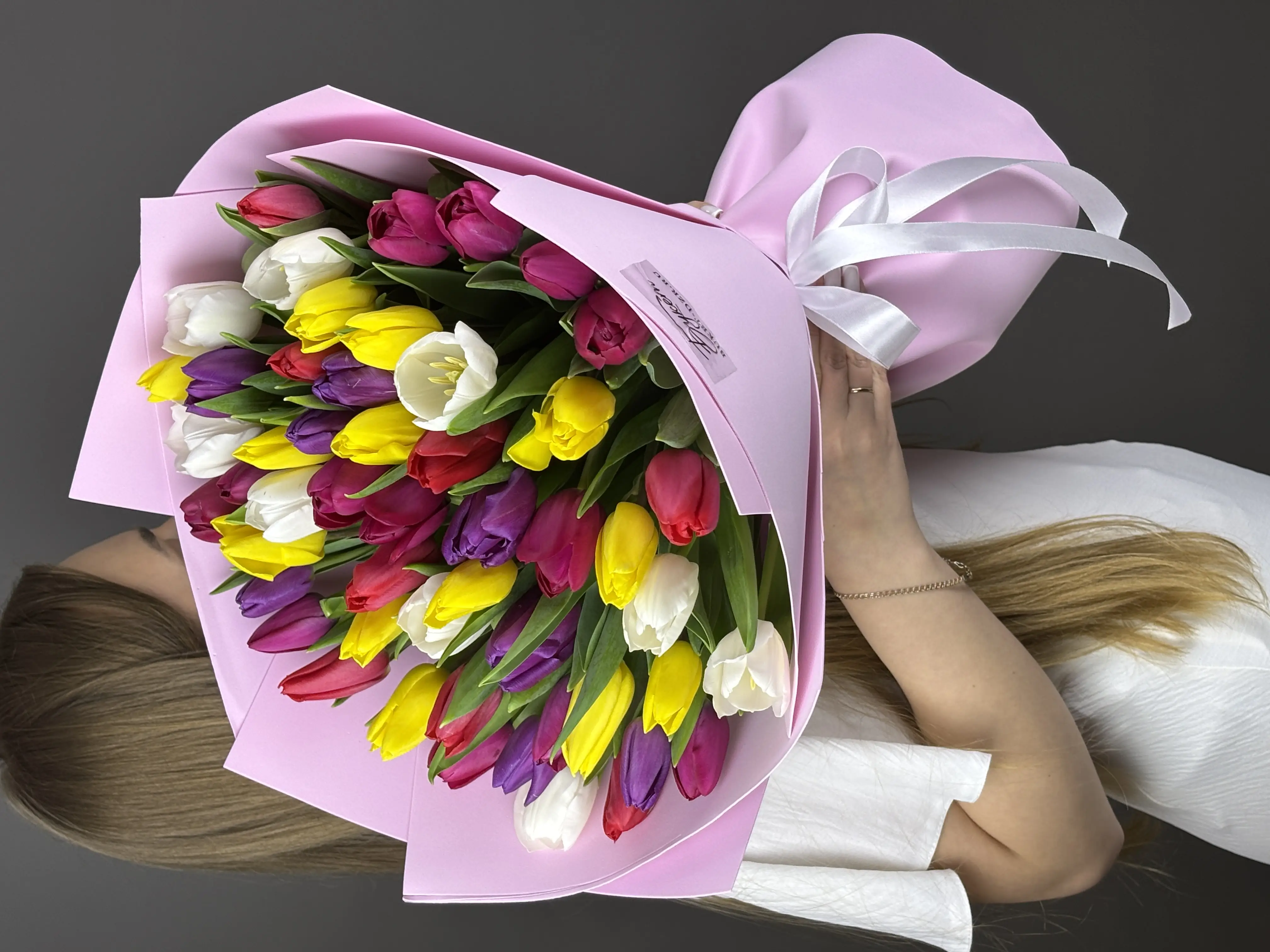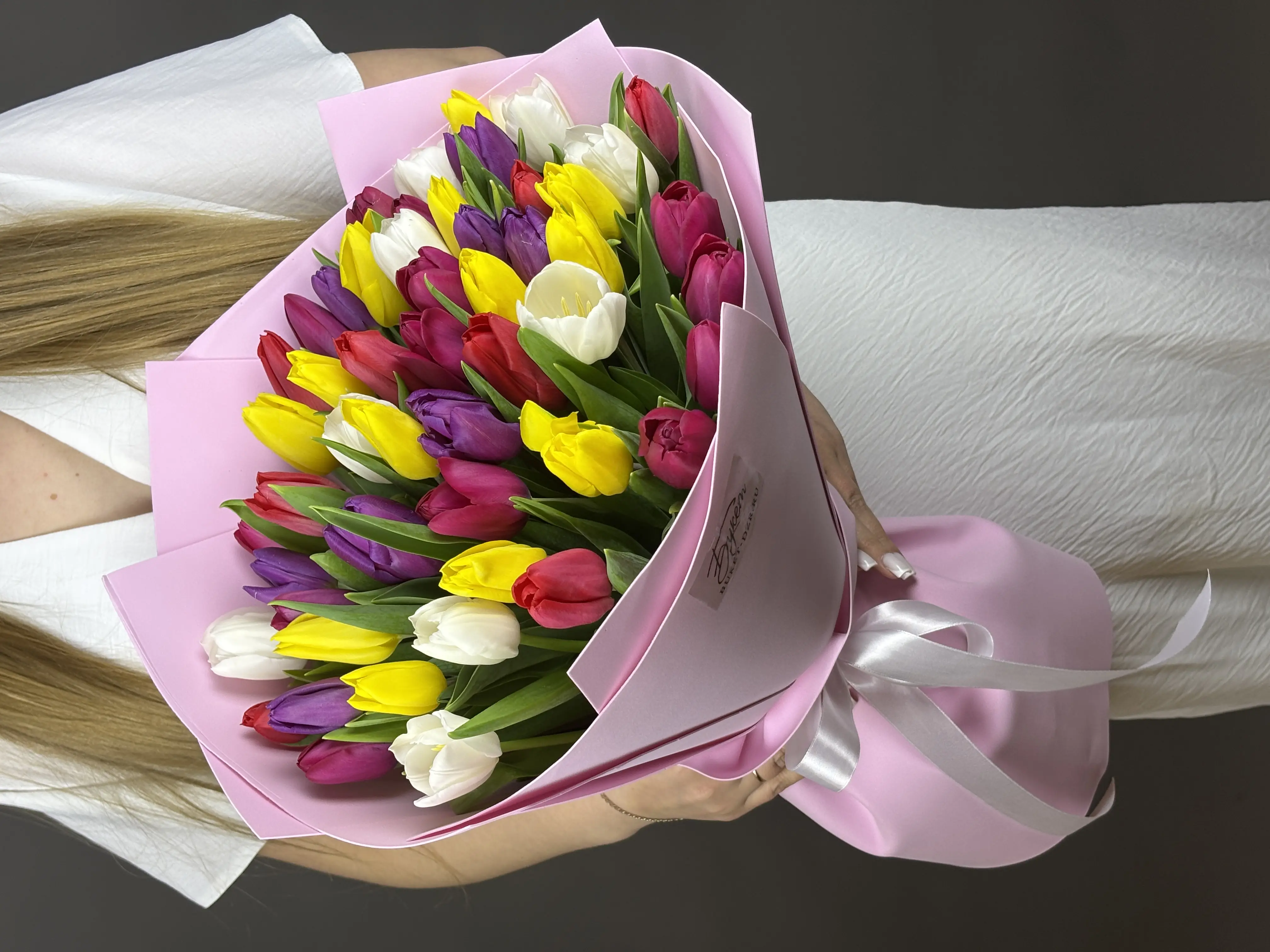 Композиция из 51 разноцветного тюльпана тюльпана — купить по цене от 13930 руб. с доставкой в Нижнем Новгороде
