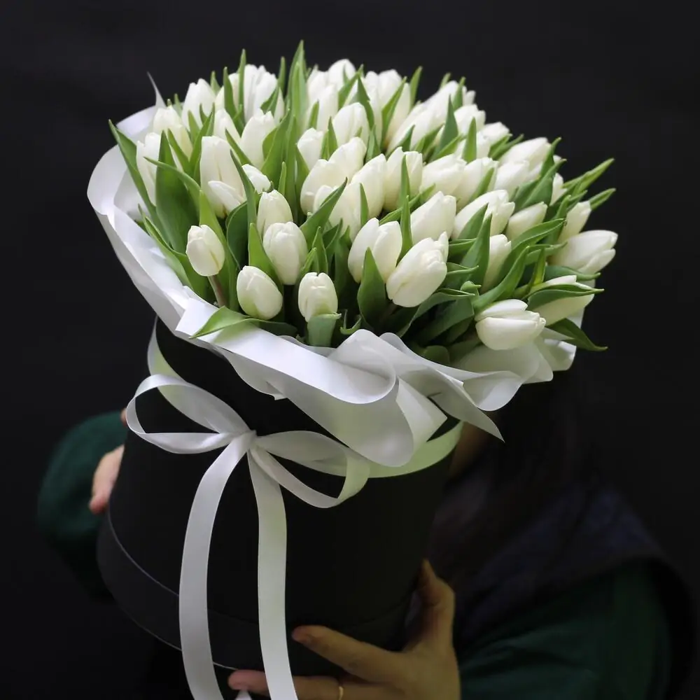 Композиция снежный тюльпан в шляпной черной коробке — купить по цене от 12690 руб. с доставкой в Нижнем Новгороде