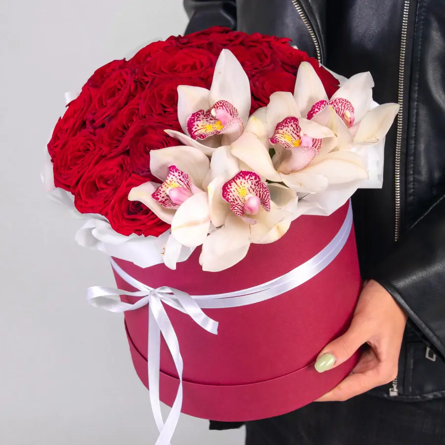Коробка с цветами из роз и орхидей — купить с доставкой в Нижнем Новгороде