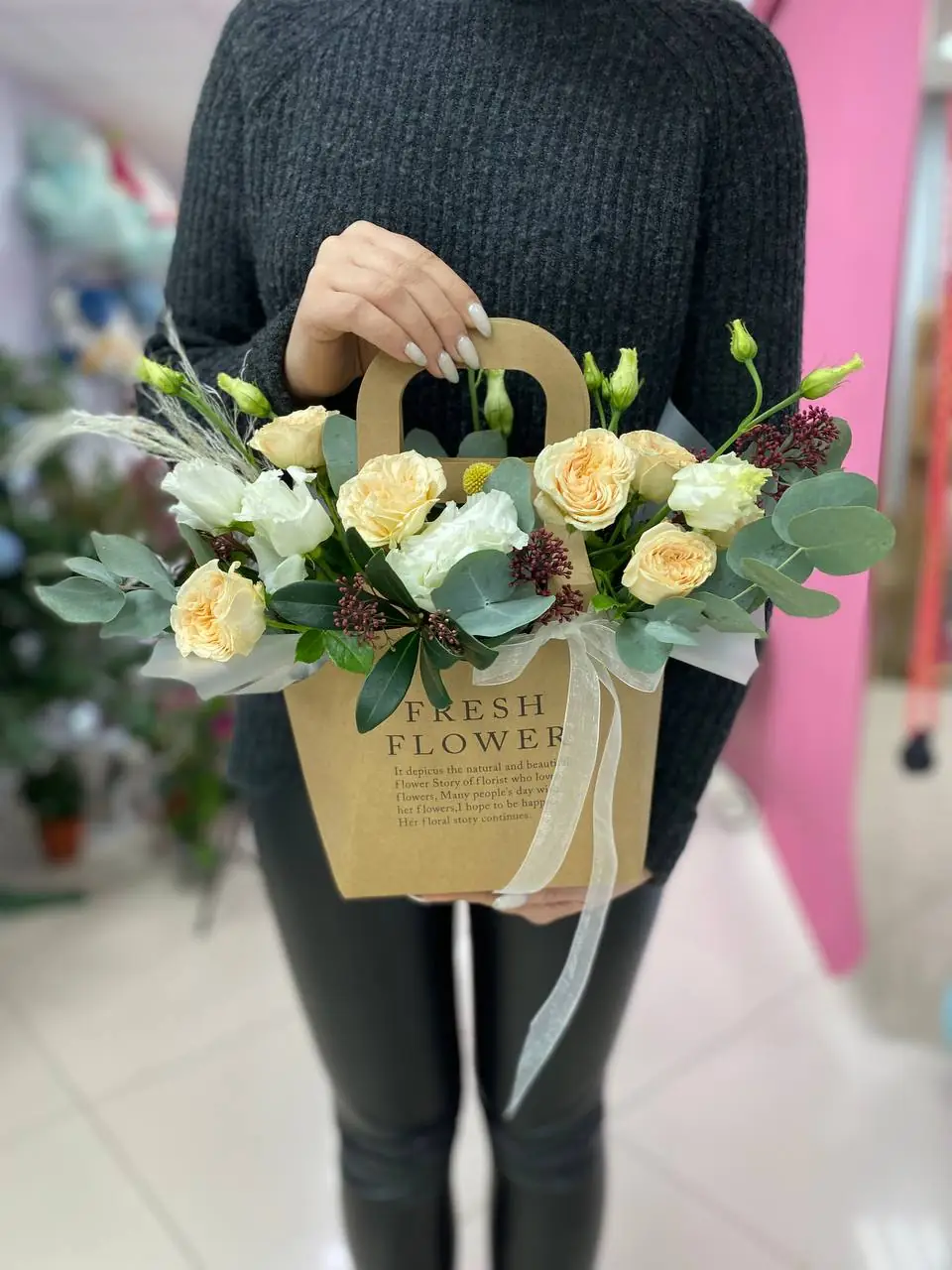 Соберем в день доставки, только из свежих цветов и затем с улыбкой вручим получателю.