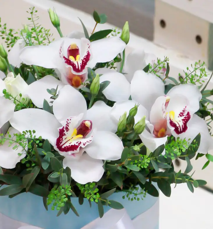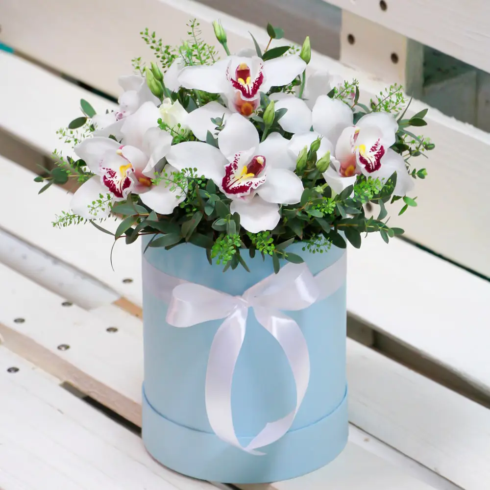 Орхидеи красивы сами по себе, а в шляпной коробке букет из этих цветов точно запомнится всем окружающим надолго.Такой презент выглядит интересно, сами цветы долго сохраняются свежими благодаря специальной флористической губке, а оригинальные сочетания оттенков позволяют подобрать красивую композицию на любой вкус.