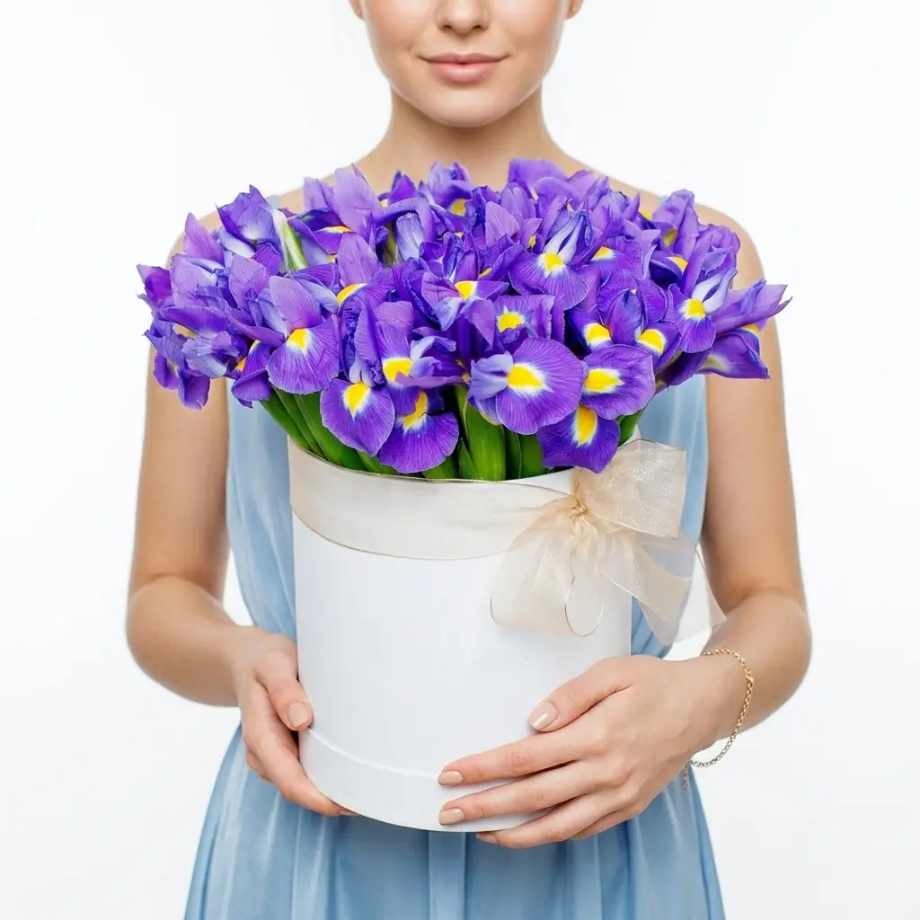 Ярко-фиолетовые ирисы в белоснежной шляпной коробке.