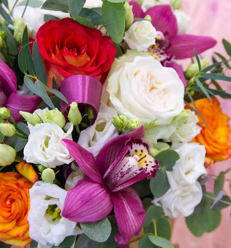 Стильная и изысканная композиция, выдержанная в необычной цветовой гамме. Оранжевые, красные и белые эквадорские розы, лизиантус и орхидеи насыщенного бордового цвета. Зелень веточек эвкалипта стала завершающей нотой в этом ансамбле.