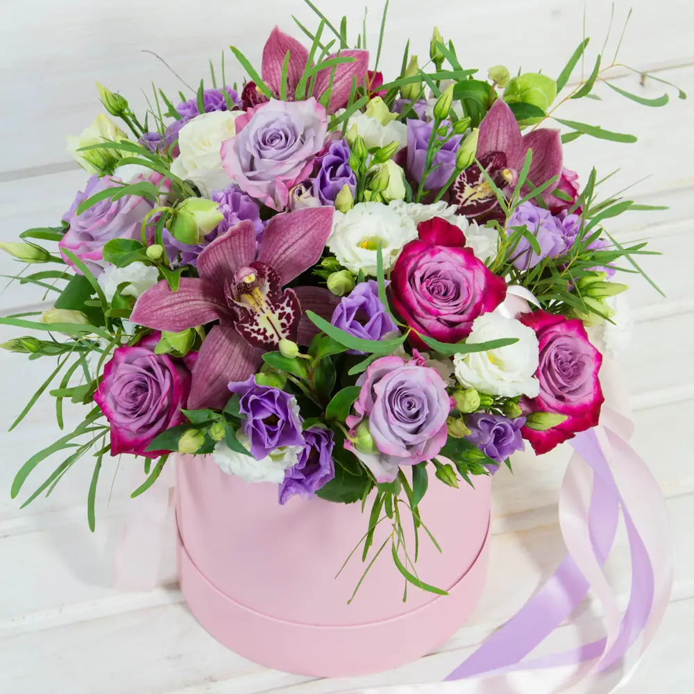 На фото - Шляпная коробка "Маскарад" . В составе данной композиции: Роза - 9 шт., Орхидея - 3 шт., Лизиантус - 5 шт., Зелень, Шляпная коробка, Флористическая губка , Лента атласная. На сайте sbuket-nn.ru Вы найдете большой выбор недорогих букетов, цветочных композиций и корзин цветов для любого повода. У нас можно заказать Шляпная коробка "Маскарад" за 6950 руб. с доставкой Нижнем Новгороде и по области