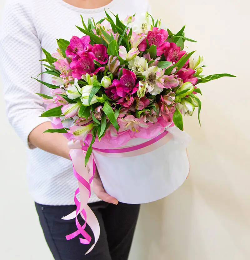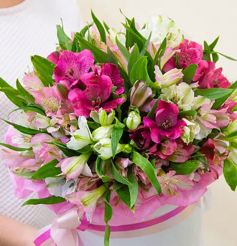 На фото - Шляпная коробка "Нежные чувства" . В составе данной композиции: Альстромерия - 13 шт., Зелень, Шляпная коробка, Флористическая губка, Лента атласная, . На сайте sbuket-nn.ru Вы найдете большой выбор недорогих букетов, цветочных композиций и корзин цветов для любого повода. У нас можно заказать Шляпная коробка "Нежные чувства" за 4270 руб. с доставкой Нижнем Новгороде и по области