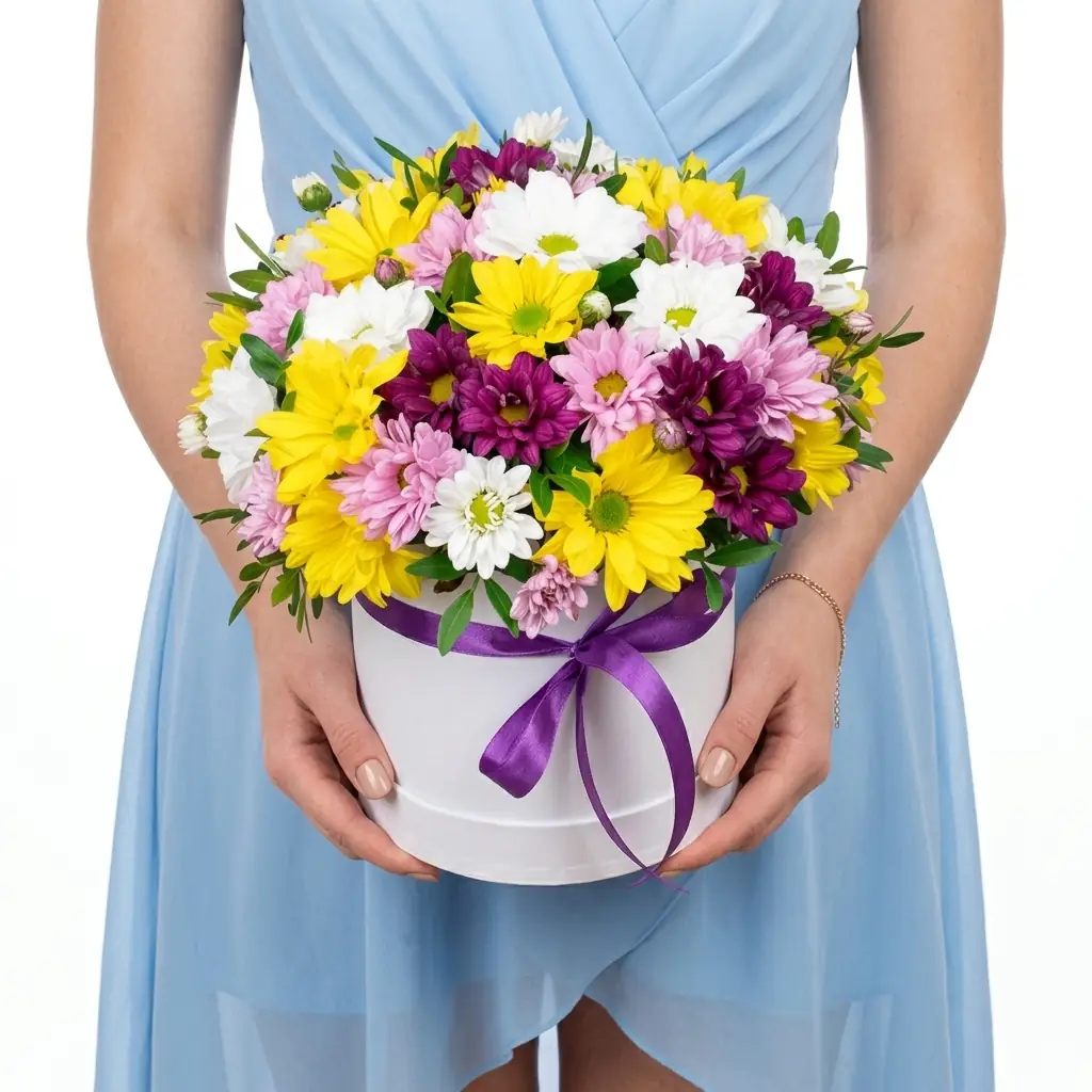 Шляпная коробка из разноцветных хризантем