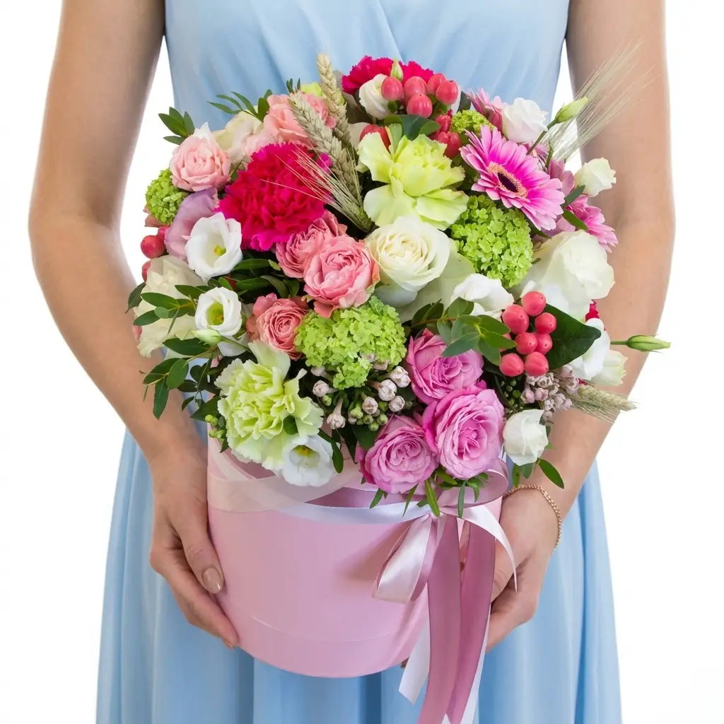 На фото - Шляпная коробка "Великолепная" . В составе данной композиции: Роза - 5 шт., Гербера - 3 шт., Диантус - 5 шт., Лизиантус - 4 шт., Роза кустовая - 4 шт., Зелень, Шляпная коробка, Флористическая губка, Лента атласная, . На сайте sbuket-nn.ru Вы найдете большой выбор недорогих букетов, цветочных композиций и корзин цветов для любого повода. У нас можно заказать Шляпная коробка "Великолепная" за 9170 руб. с доставкой Нижнем Новгороде и по области