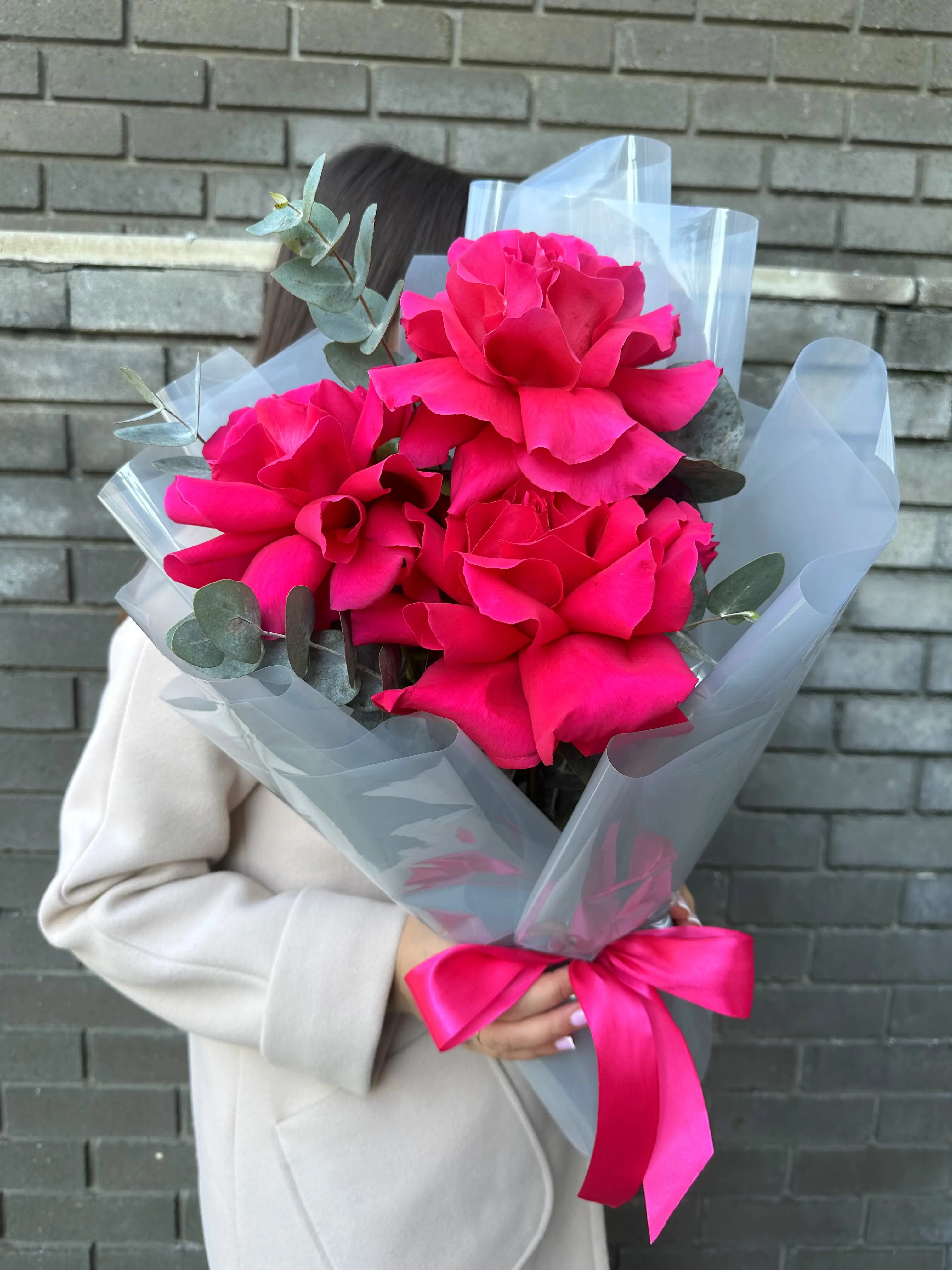 Розы в букете имеют насыщенный розовый цвет, который символизирует любовь, страсть и нежность. Эвкалипт добавляет композиции свежести и легкости, делая ее еще более привлекательной.