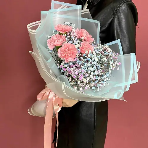 Букет из диантуса и гипсофилы - это сочетание изысканности и нежности, которое станет прекрасным подарком для любого случая.