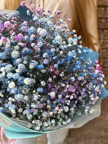 Букет из гипсофилы в голубой упаковке - это стильный и яркий подарок, который подойдет для любого повода.