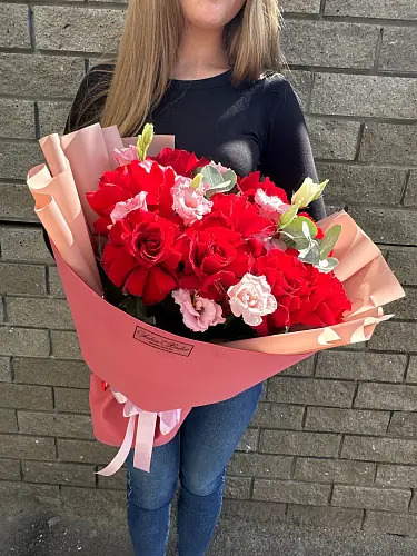 Букет с эустомой и красными розами - это стильный и элегантный подарок, который подойдет для любого повода.