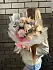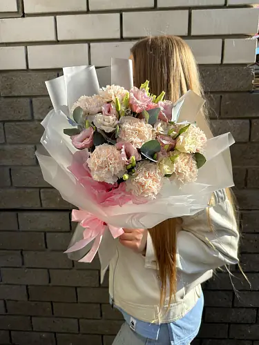 Букет состоит из семи гвоздик и трех эустом, что придает ему пышность и объем. Цветы имеют нежный бежевый и розовый оттенок, что делает их подходящими для любого возраста и пола.