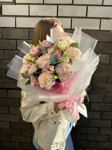 Букет с гвоздикой и эустомой - это стильный и элегантный сборный букет, который станет отличным подарком для любого повода.