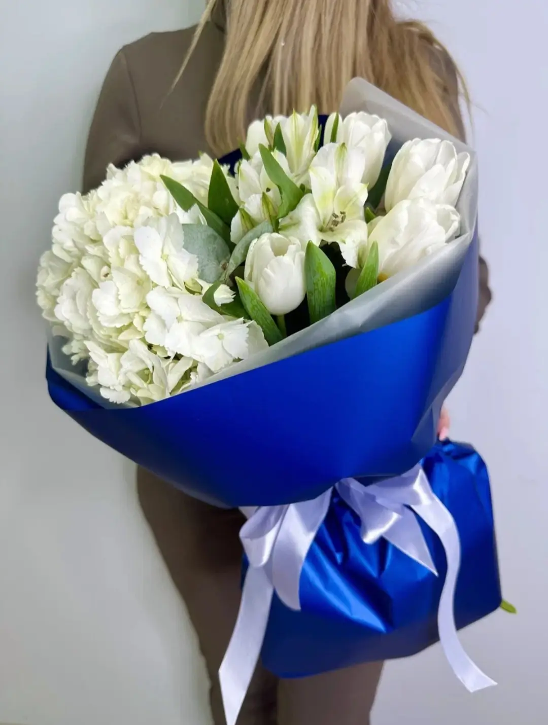 Букет с тюльпанами и гортензией - это сочетание элегантности и свежести, которое станет прекрасным подарком для любого случая.