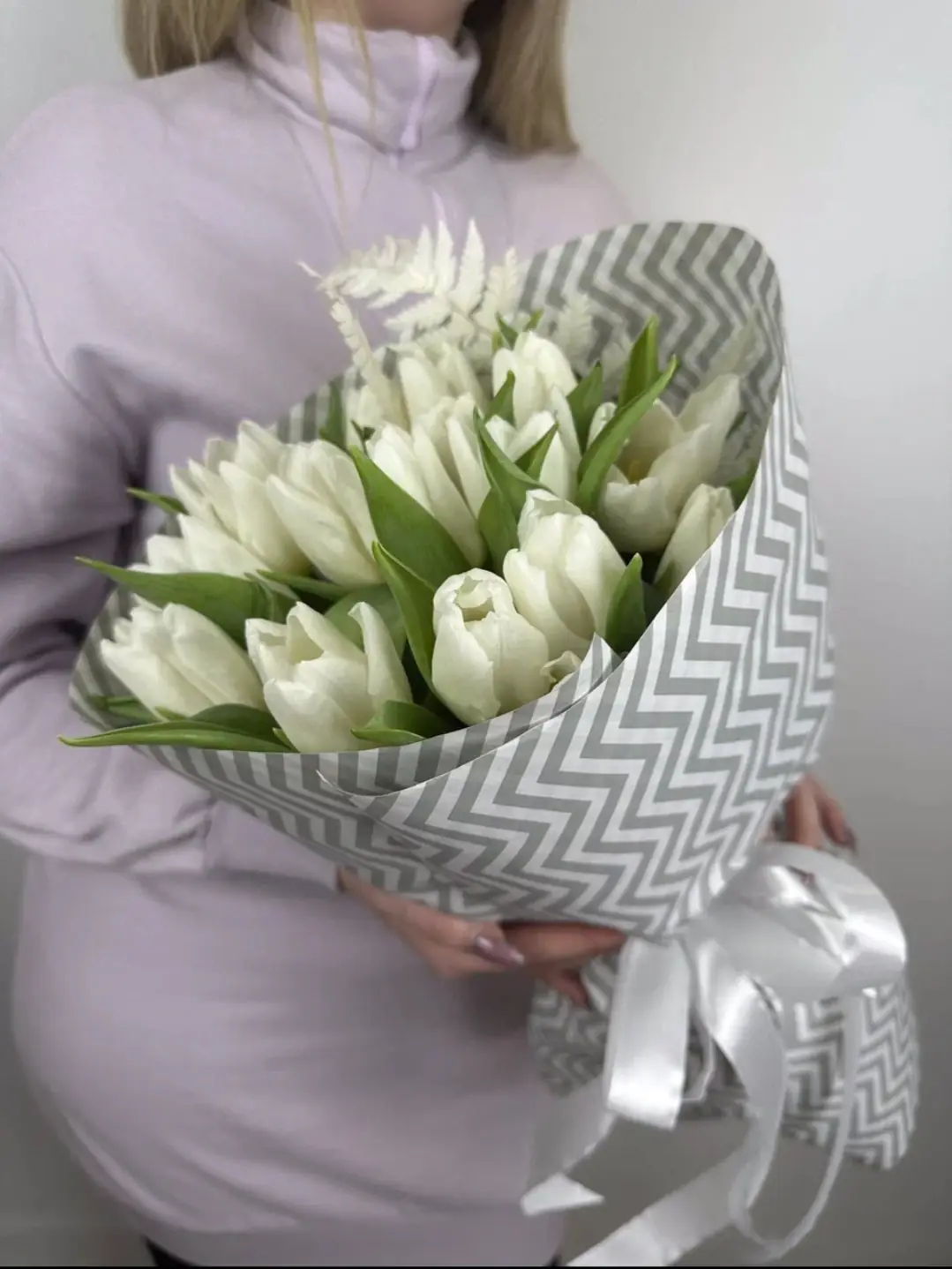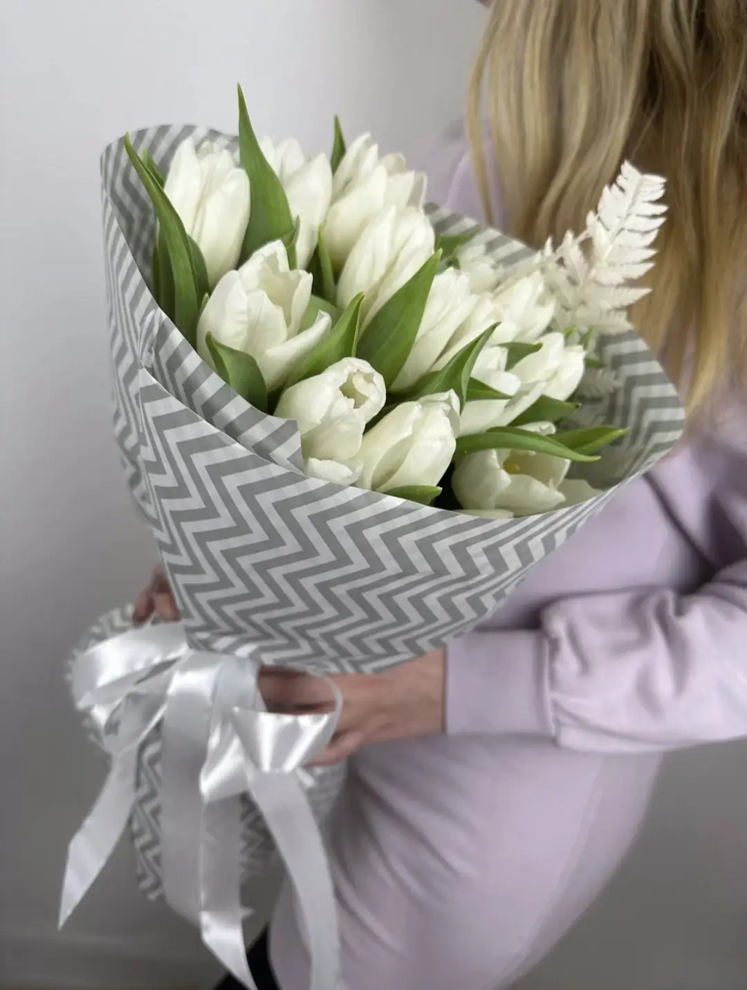 Букет живых цветов из 15 белых тюльпанов в дизайнерской упаковке - это изысканный и стильный подарок, который станет прекрасным дополнением к любому торжественному событию.