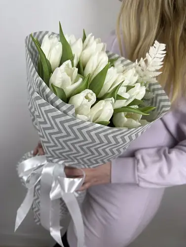 Букет состоит из 15 свежих и ароматных белых тюльпанов, которые символизируют нежность, чистоту и искренность чувств.