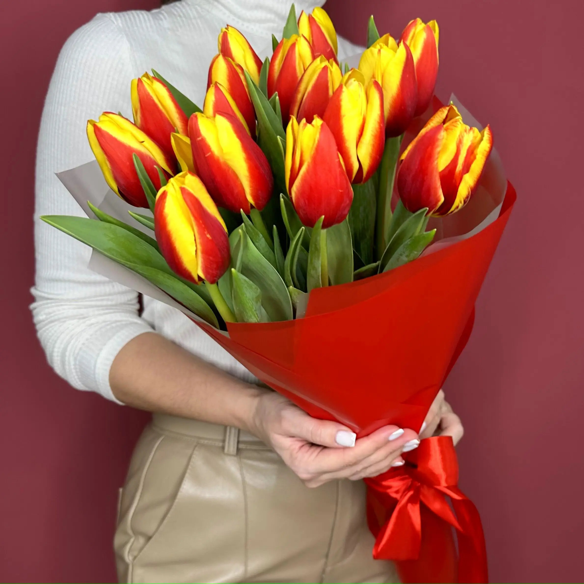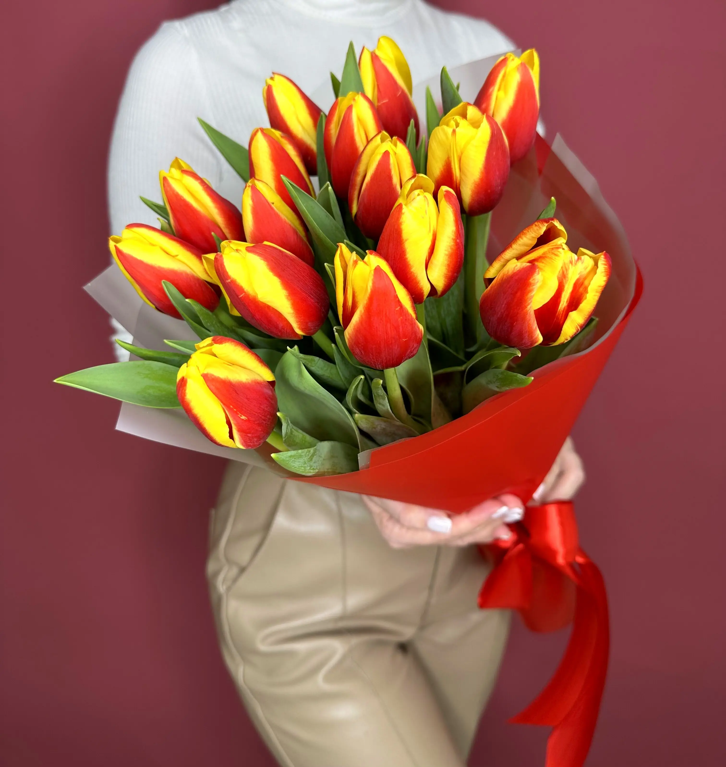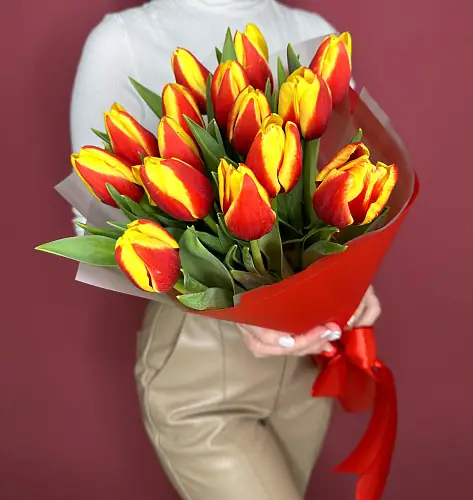 Букет состоит из 15 ярких тюльпанов, которые радуют глаз своим разнообразием цветов – красные, желтые. Тюльпаны – символ весны и радости, они добавят в ваш праздник атмосферу свежести и тепла.