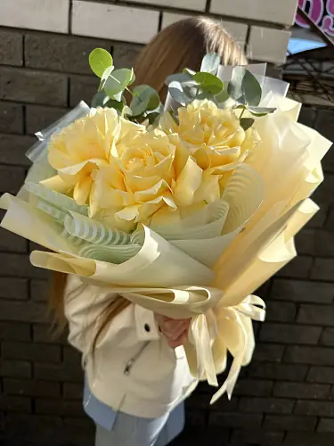 Розы в букете – это символ любви и нежности, а эвкалипт добавляет свежести и аромата.