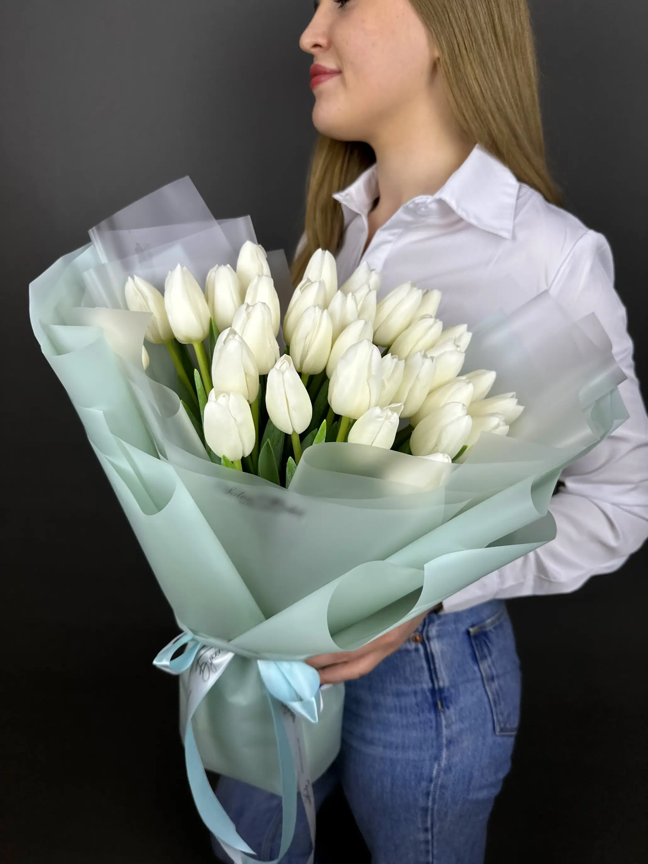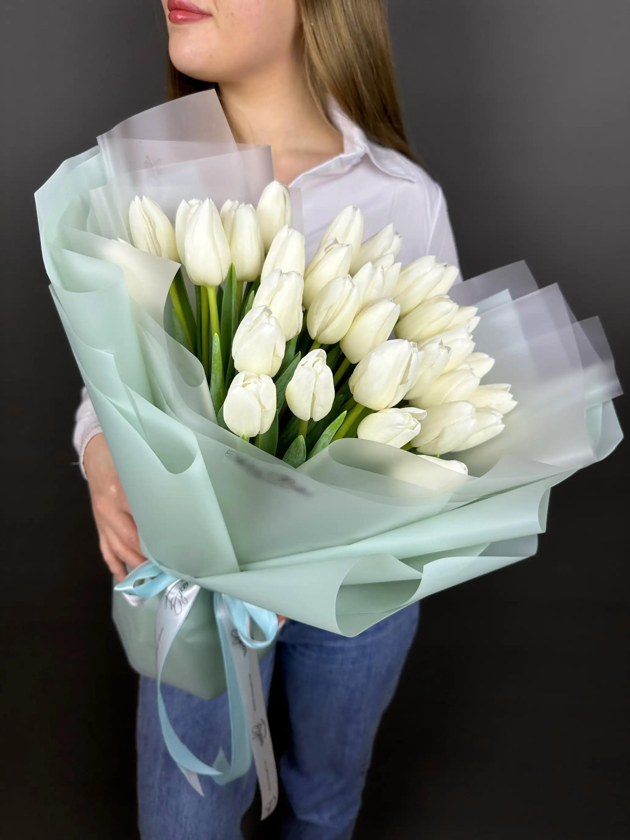 Букет живых цветов из 31 Белого тюльпана в дизайнерской упаковке - это изысканный и стильный подарок, который обязательно порадует получателя.