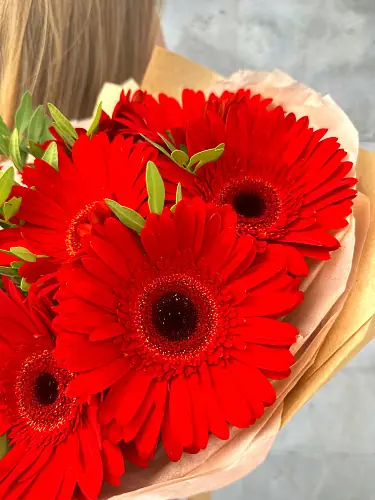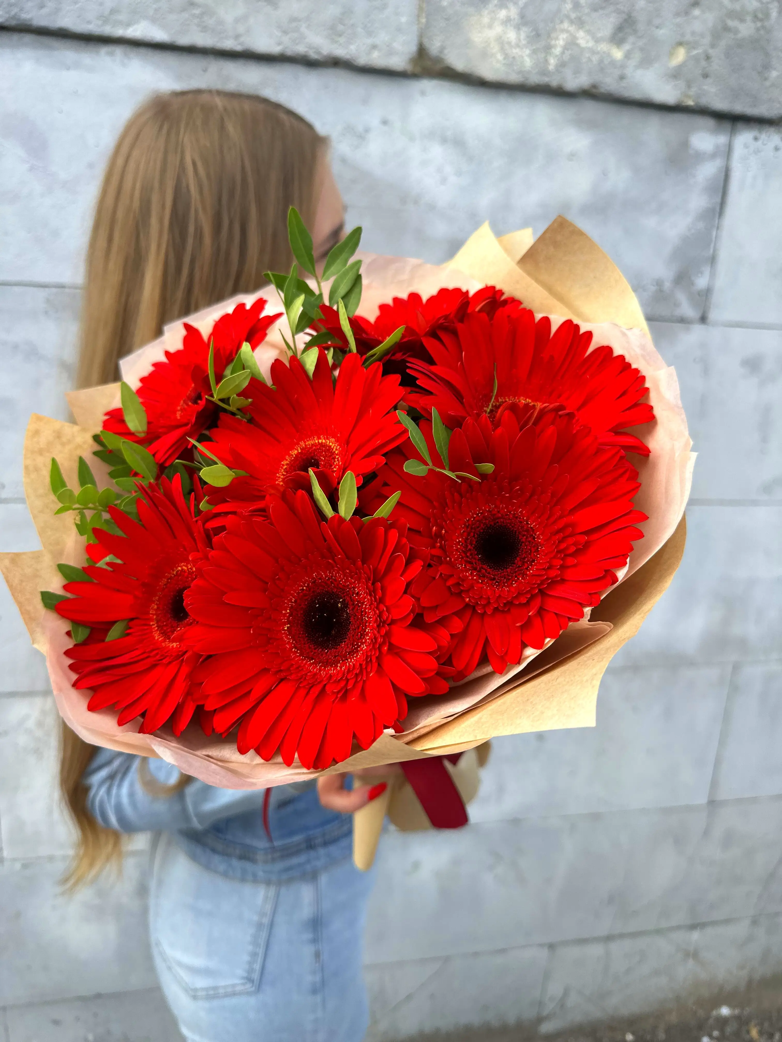 Букет состоит из 7 красных гербер, которые являются символом любви и страсти. Фисташковые листья добавляют свежести и гармонии, а дизайнерская упаковка подчеркивает индивидуальность и вкус подарка.