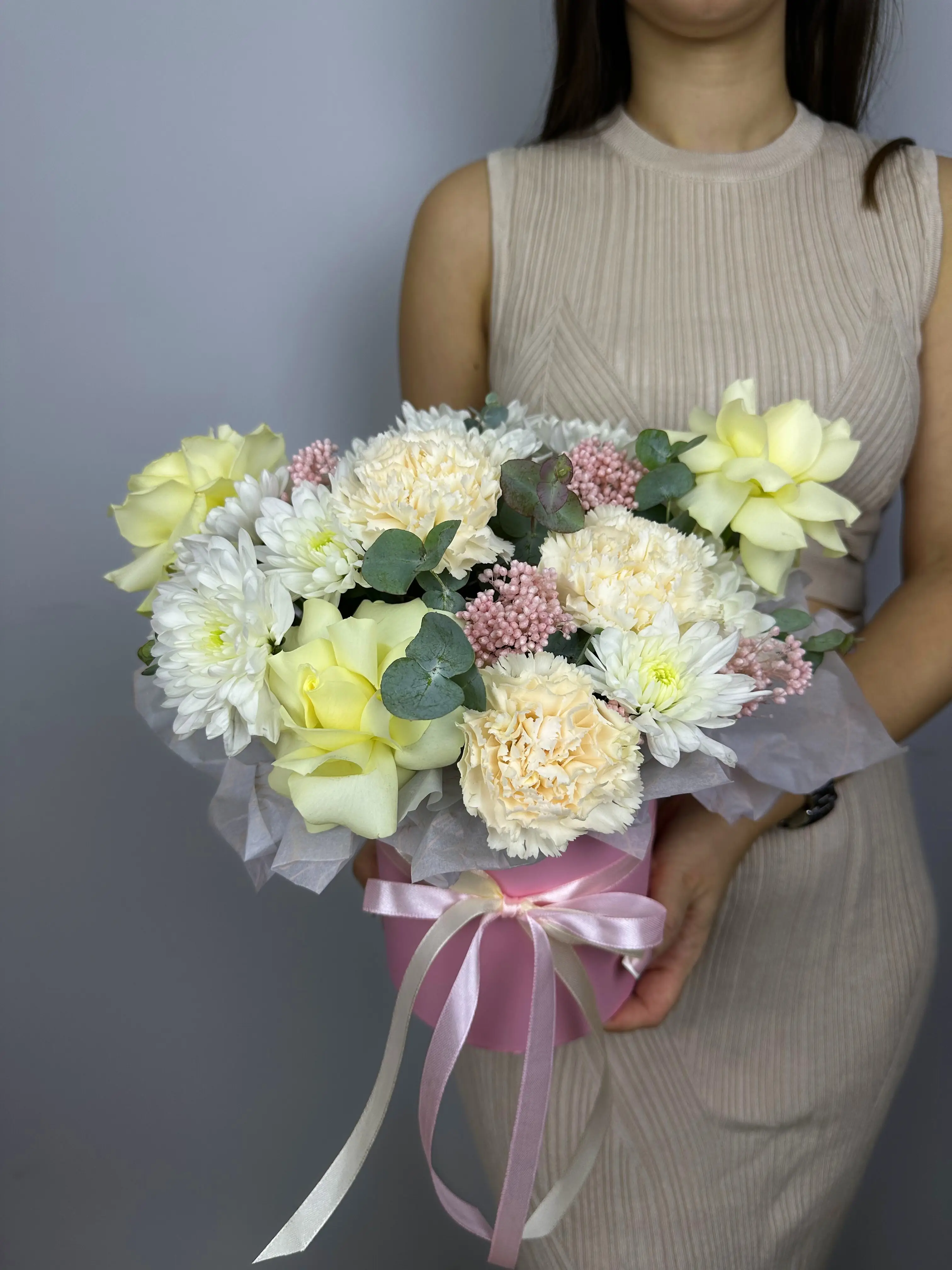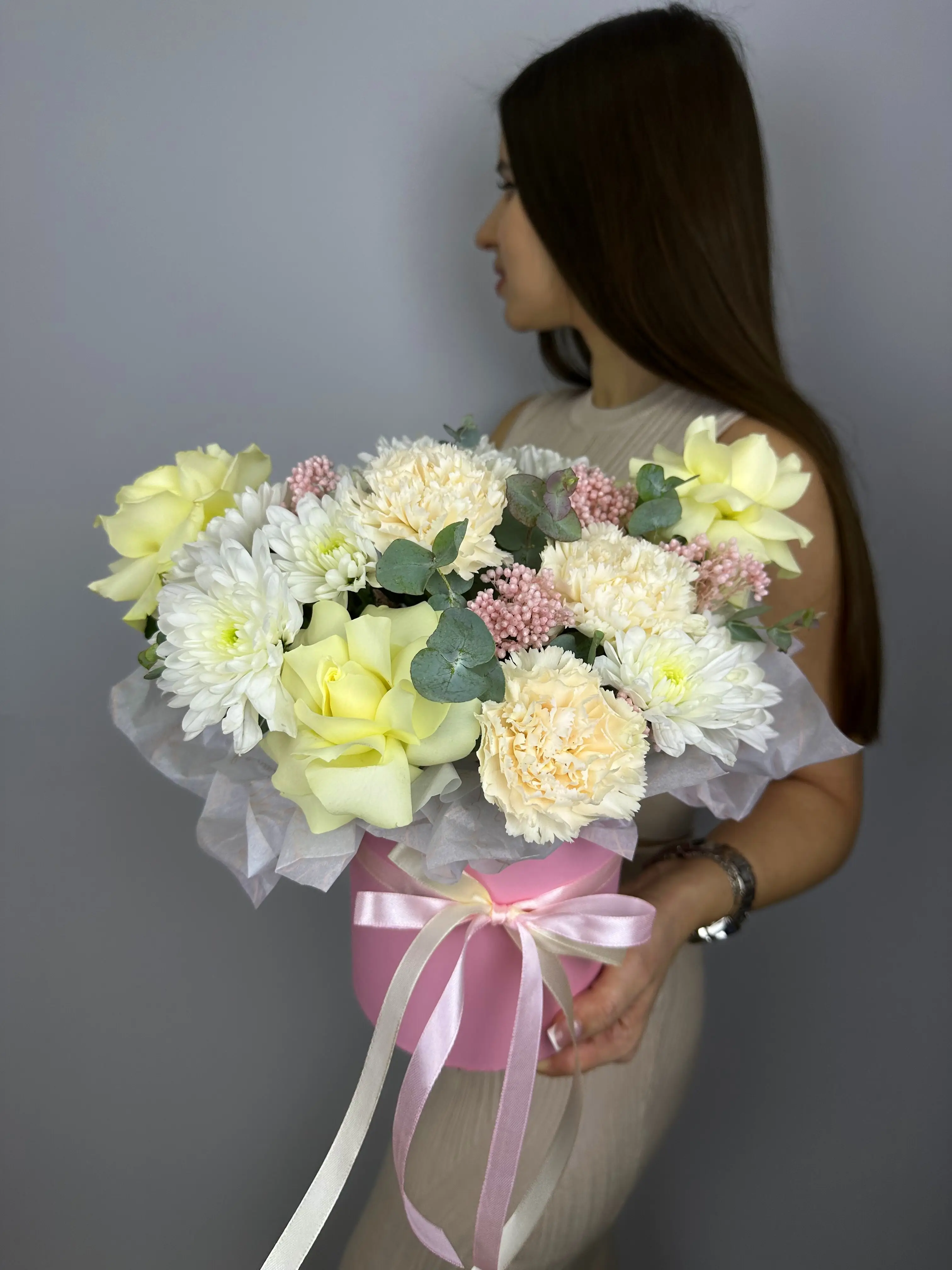 Букет оформлен в стильную шляпную коробку, которая обеспечивает надежную защиту цветов от внешних воздействий и сохраняет свежесть цветов на долгое время. На дне коробки находится влагоудерживающая губка, которая снабжает растения водой и предотвращает их увядание.