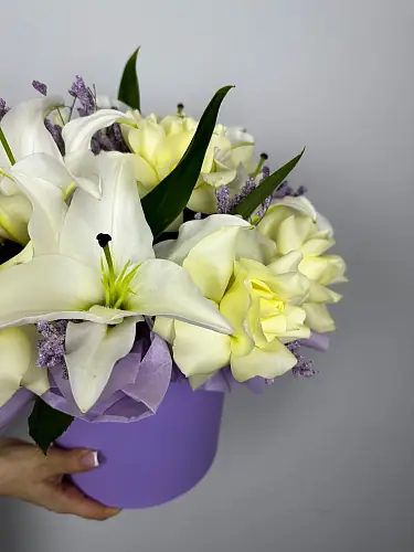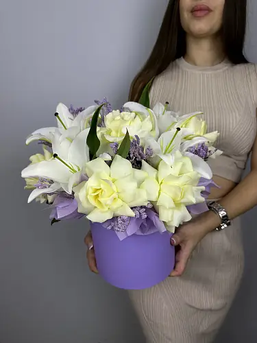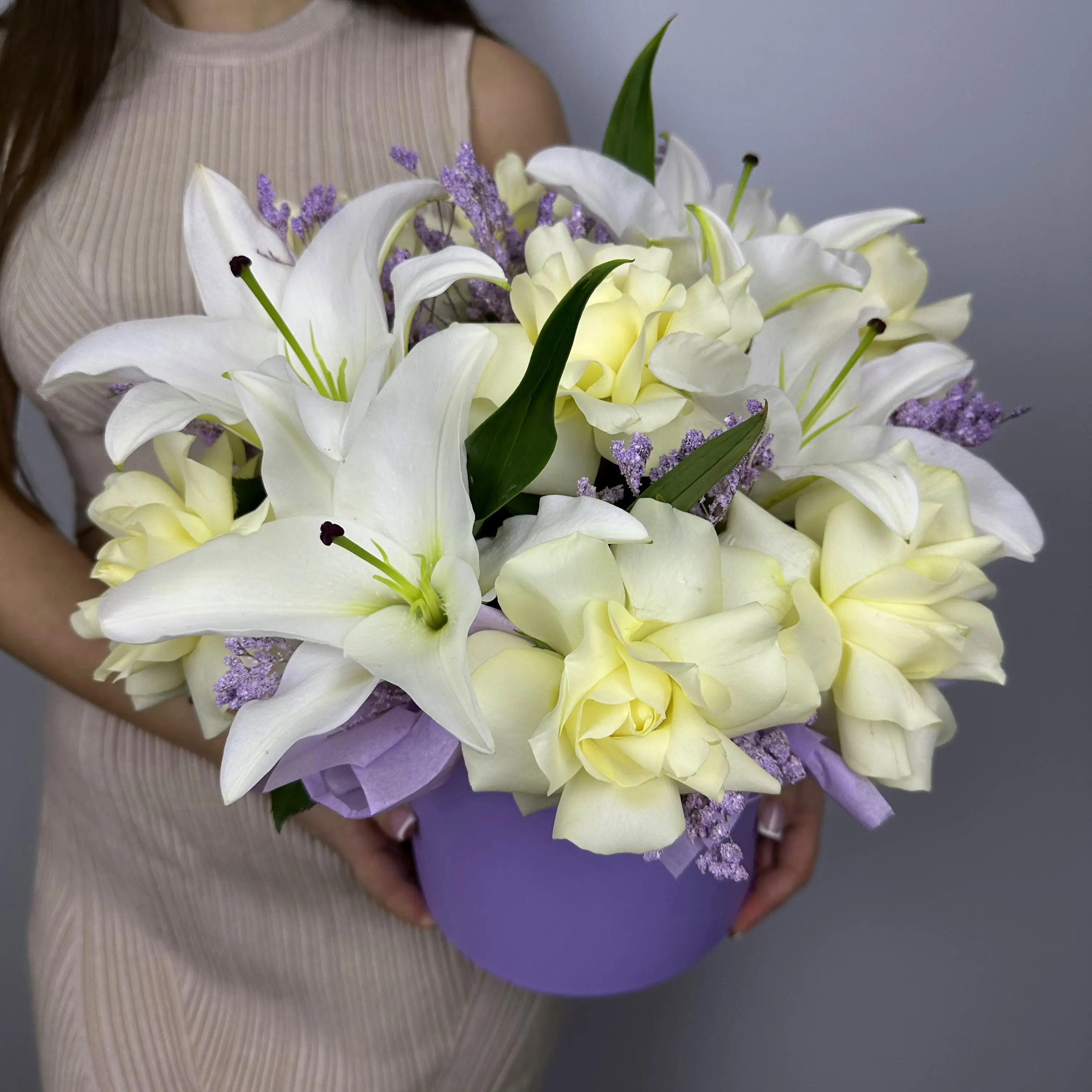 Букет живых цветов с лилией и французскими розами в шляпной коробке - это изысканный и стильный подарок, который станет прекрасным дополнением к любому торжественному событию.