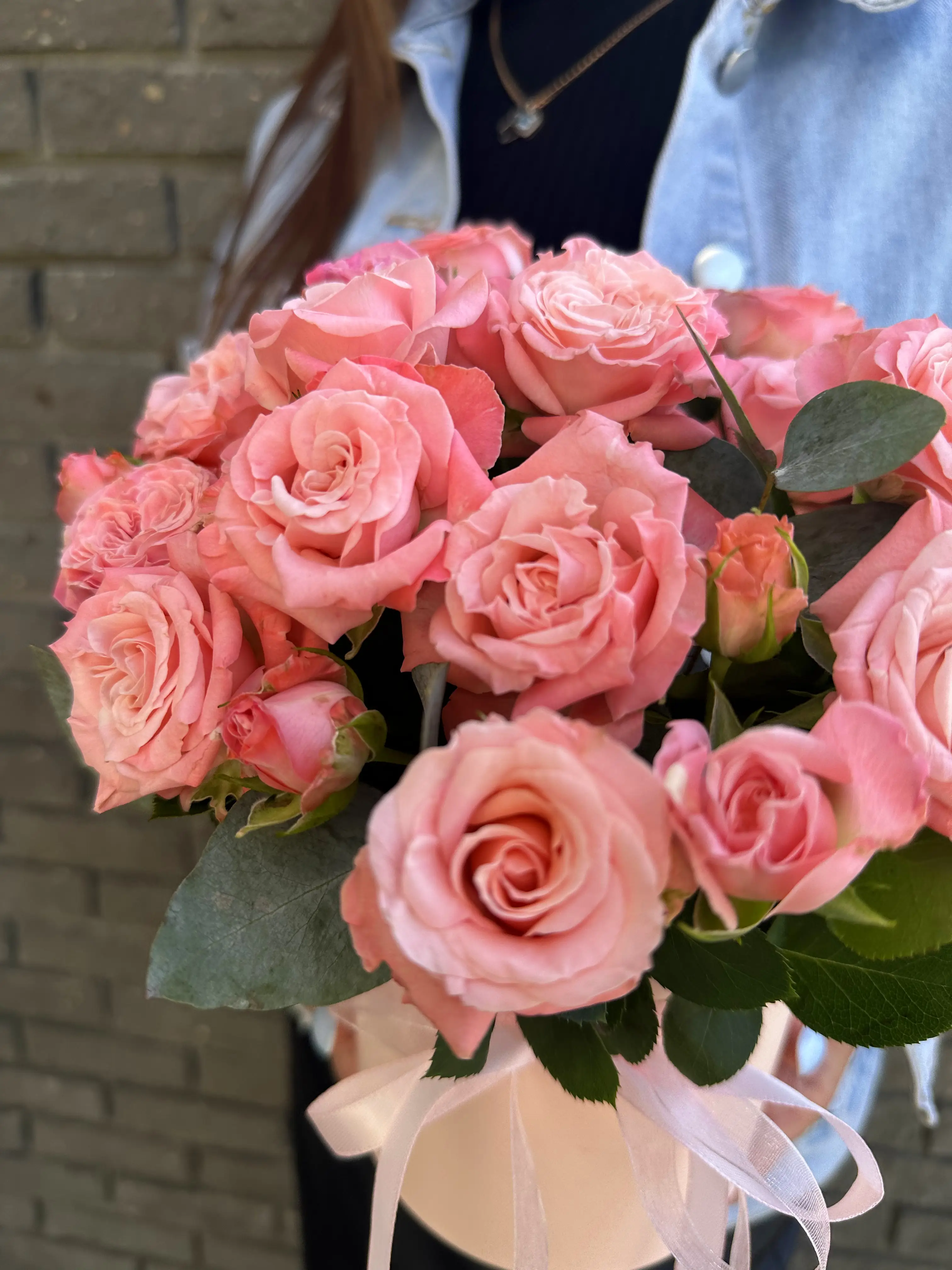 Букет живых цветов с нежными кустовыми розами в красивой шляпной коробке - это изысканный и стильный подарок, который обязательно порадует и удивит получателя.