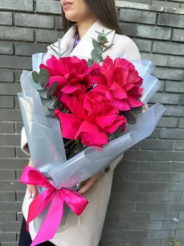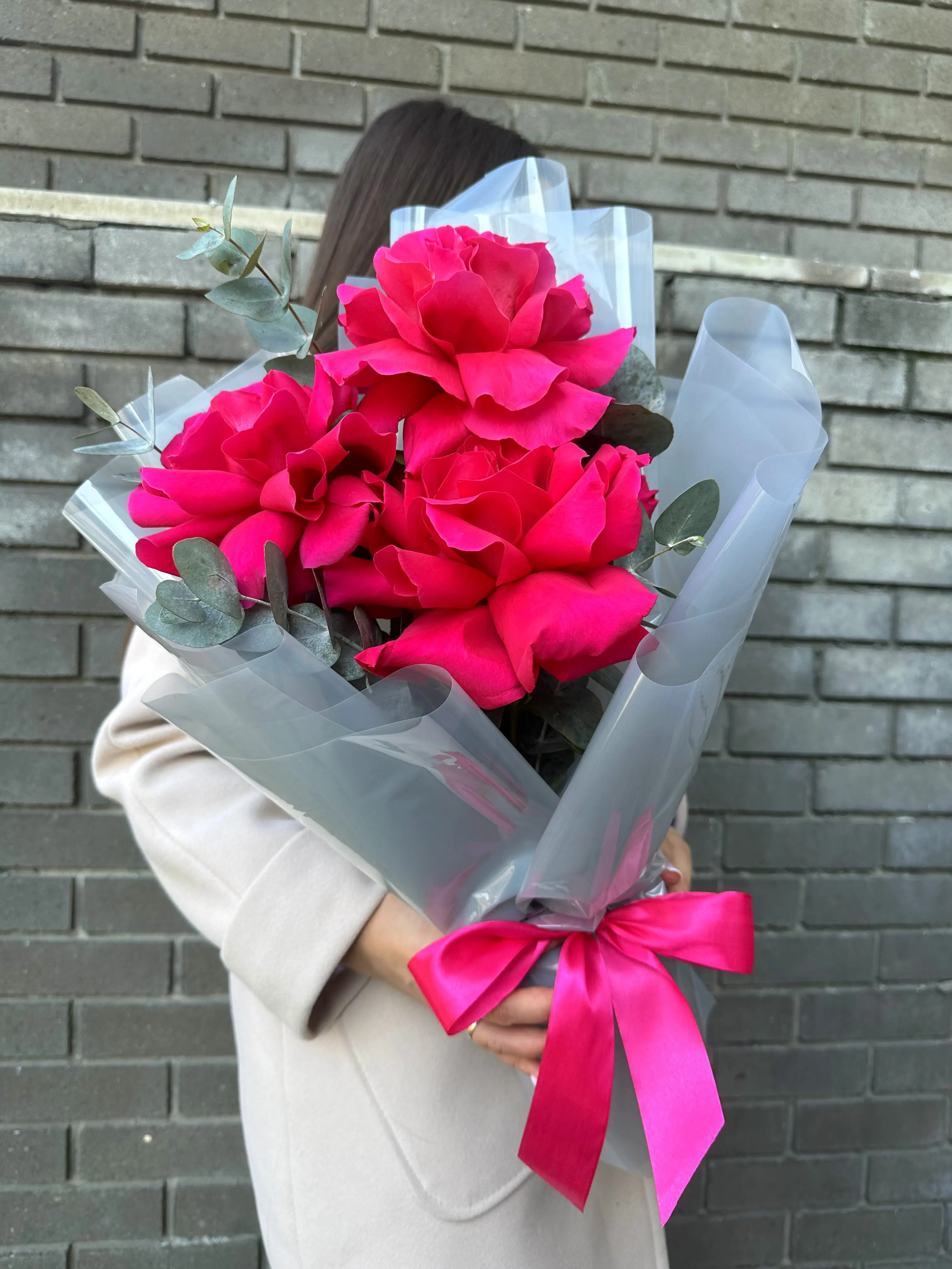 Букет живых цветов из 3 французских розовых роз с эвкалиптом в дизайнерской упаковке