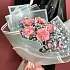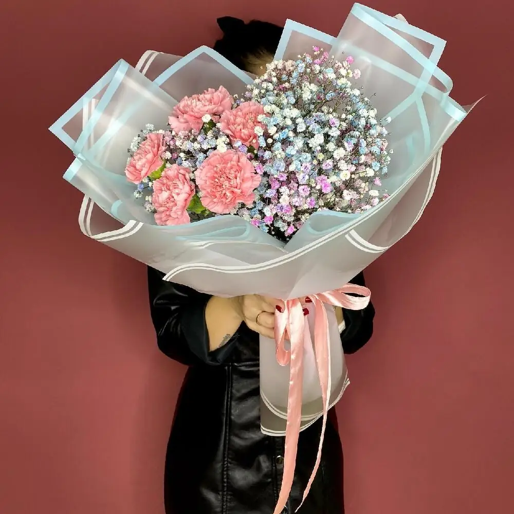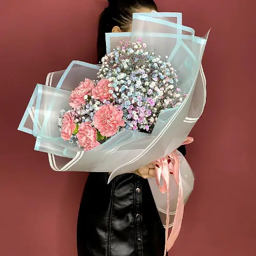 Букет живых цветов из диантусов и гипсофилы в дизайнерской упаковке