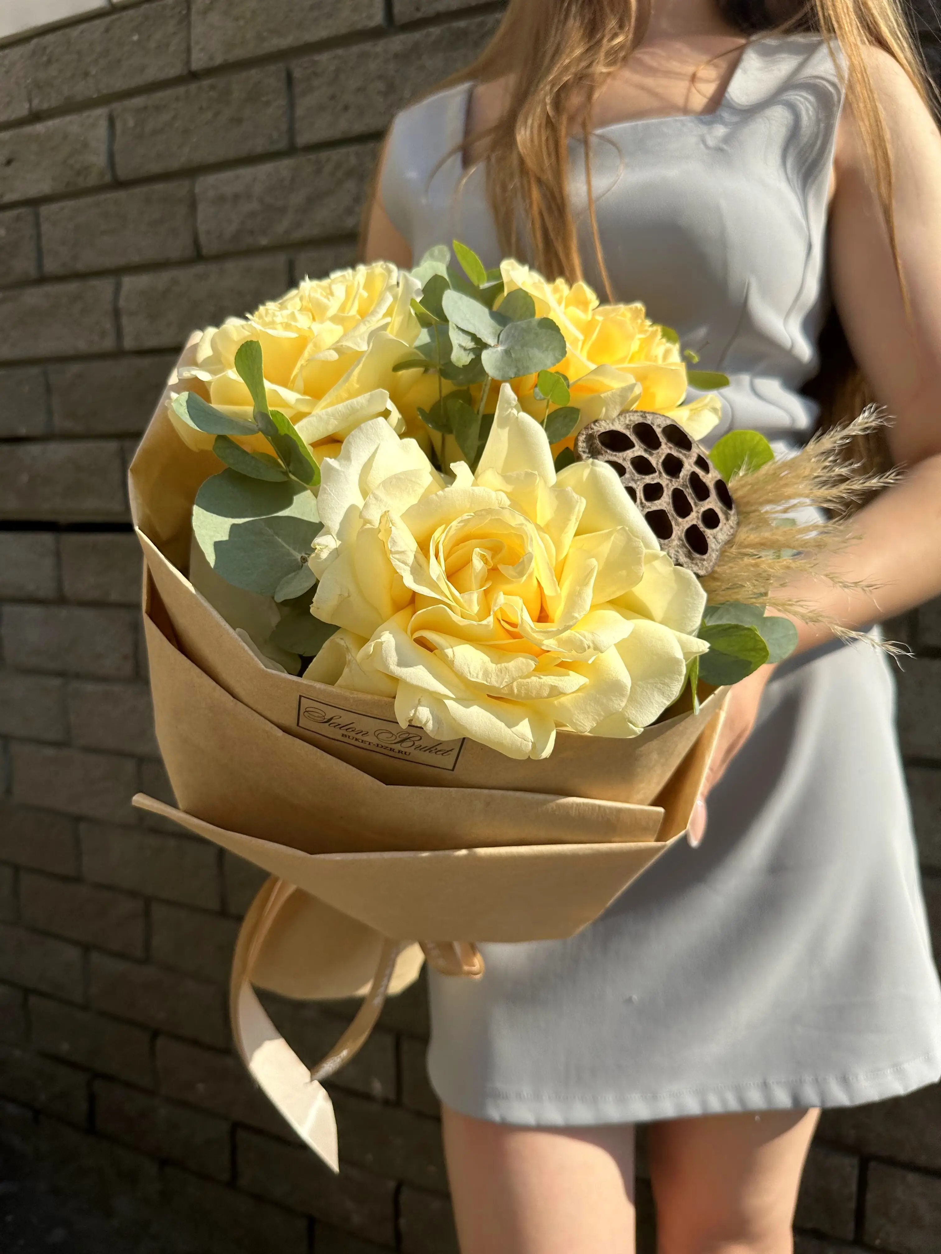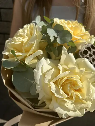Букет живых цветов из белых роз и эвкалипта в дизайнерской упаковки