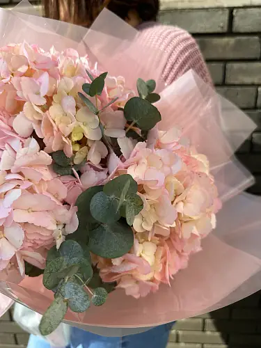 Букет живых цветов из розовых гортензий с эвкалиптом в дизайнерской упаковке
