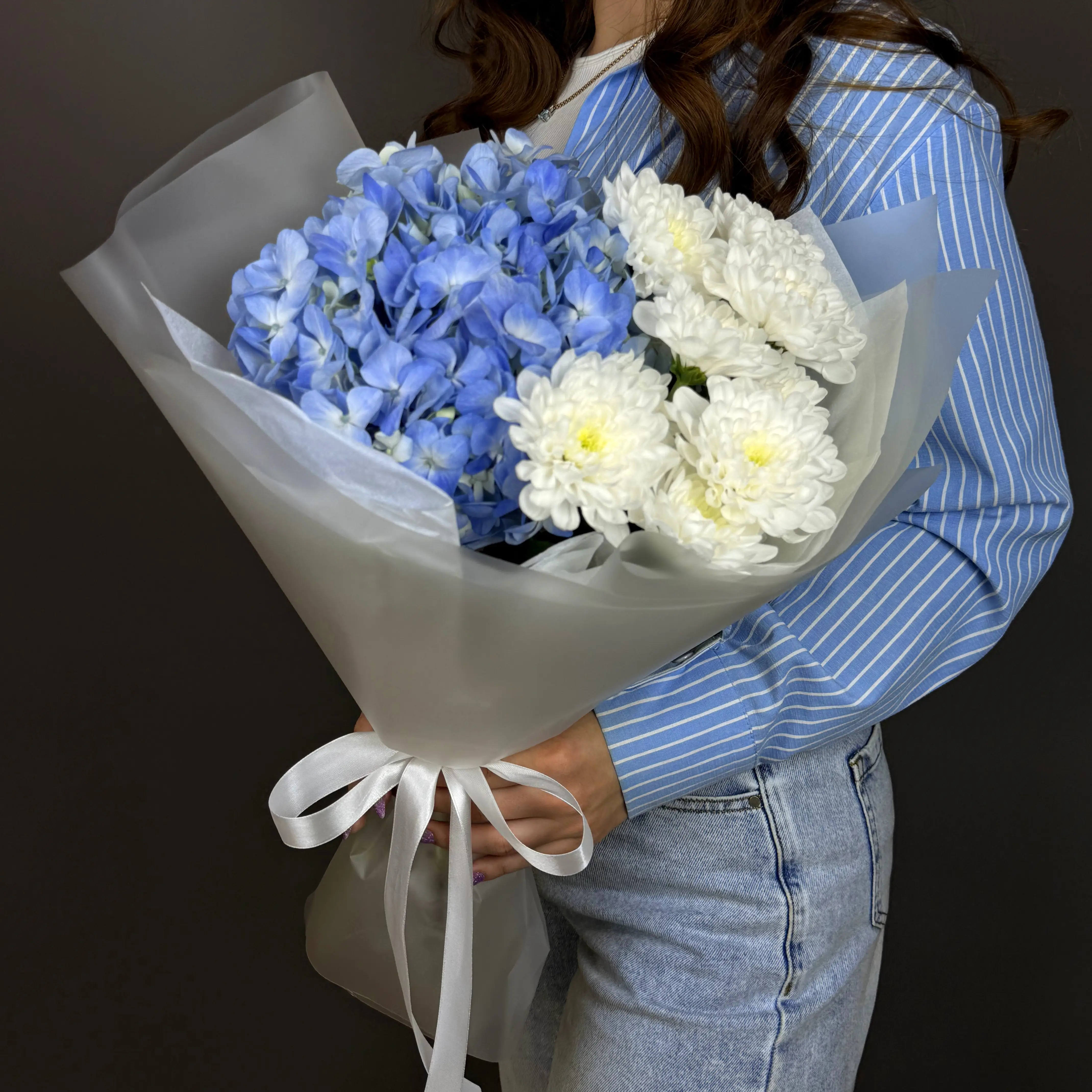Вашему вниманию предлагается изумительный букет, в котором нежная голубая гортензия встречает свою компанию с кустовой хризантемой. Эта композиция воплощает собой гармонию и стиль, радуя взгляд своими мягкими линиями и изысканными оттенками.