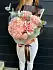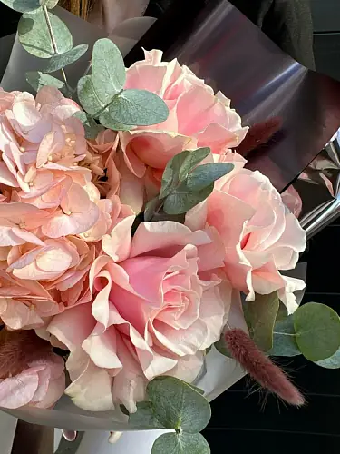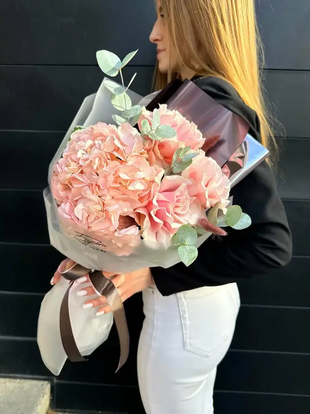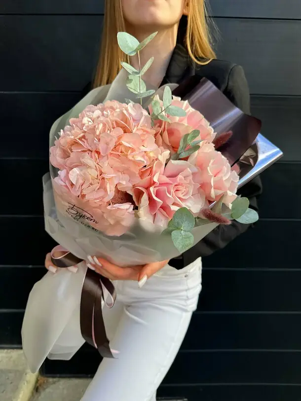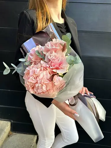 Букет живых цветов с розовой гортензией и французскими розами в дизайнерской упаковке