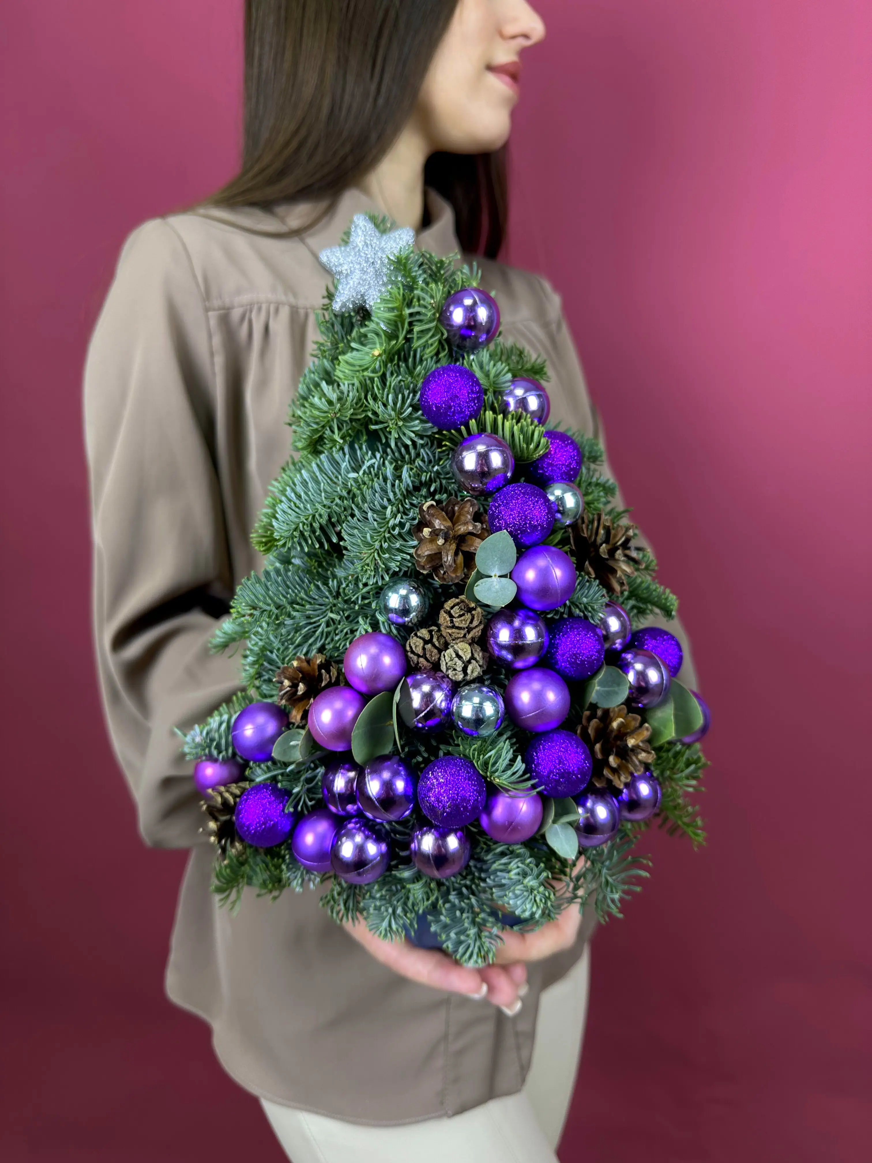 Цветы живые, Новогодняя композиция из с нобилисом "Елка с фиолетовыми шарами"