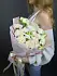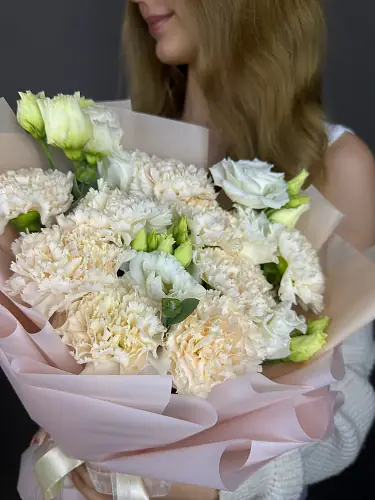 Букет нежных живых цветов из эустомы и гвоздики в дизайнерской упаковке