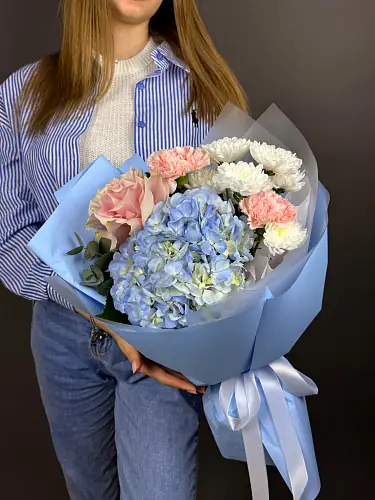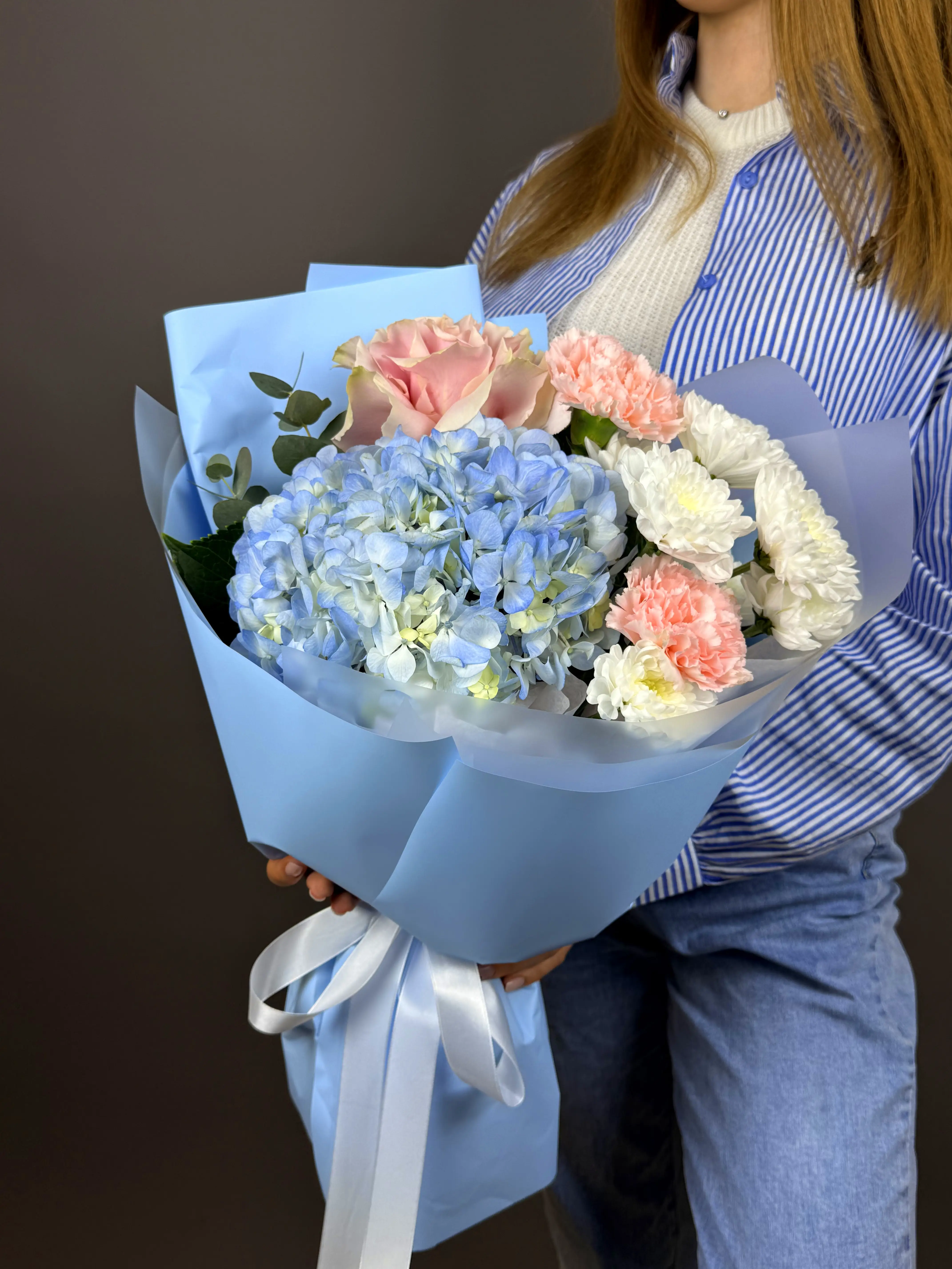 Нежный букет живых цветов с голубой гортензией в дизайнерской упаковке