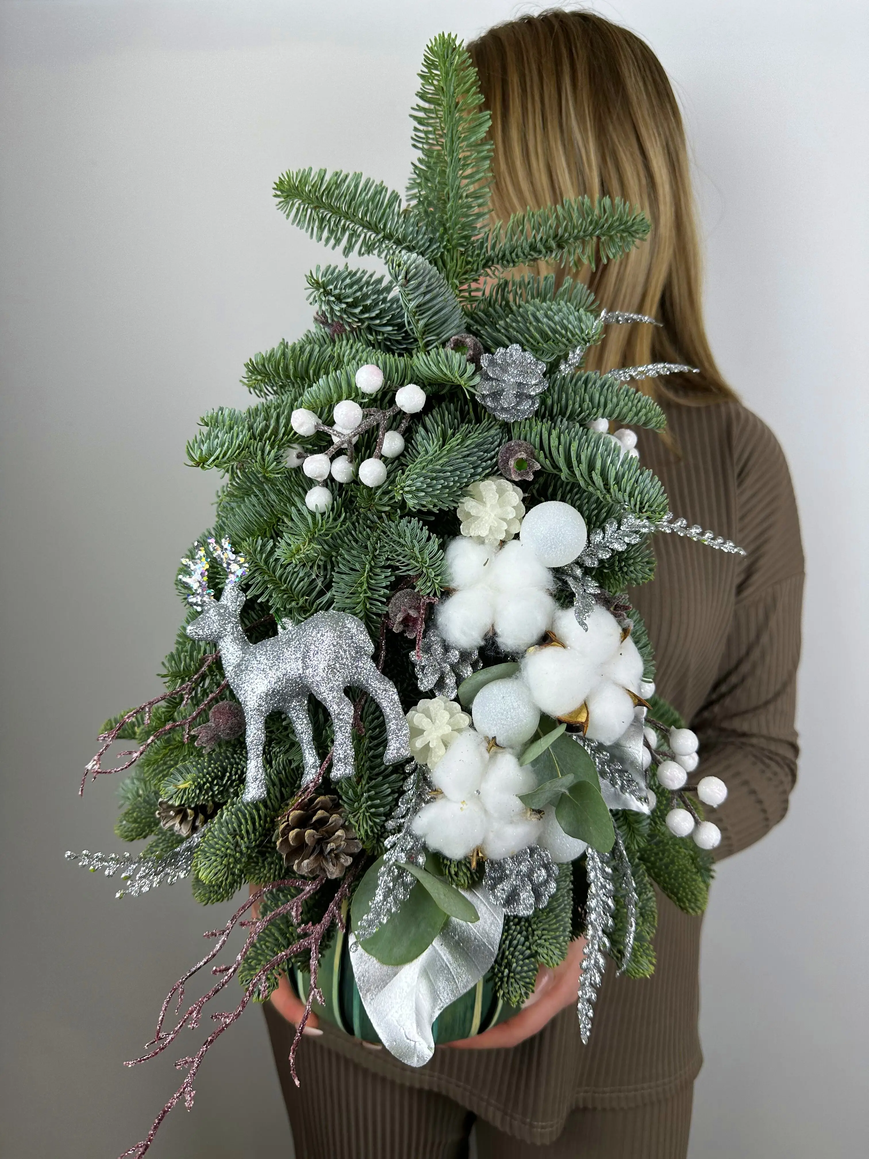 Цветы живые, Новогодняя композиция "Ёлка с оленем" в красивой корзине