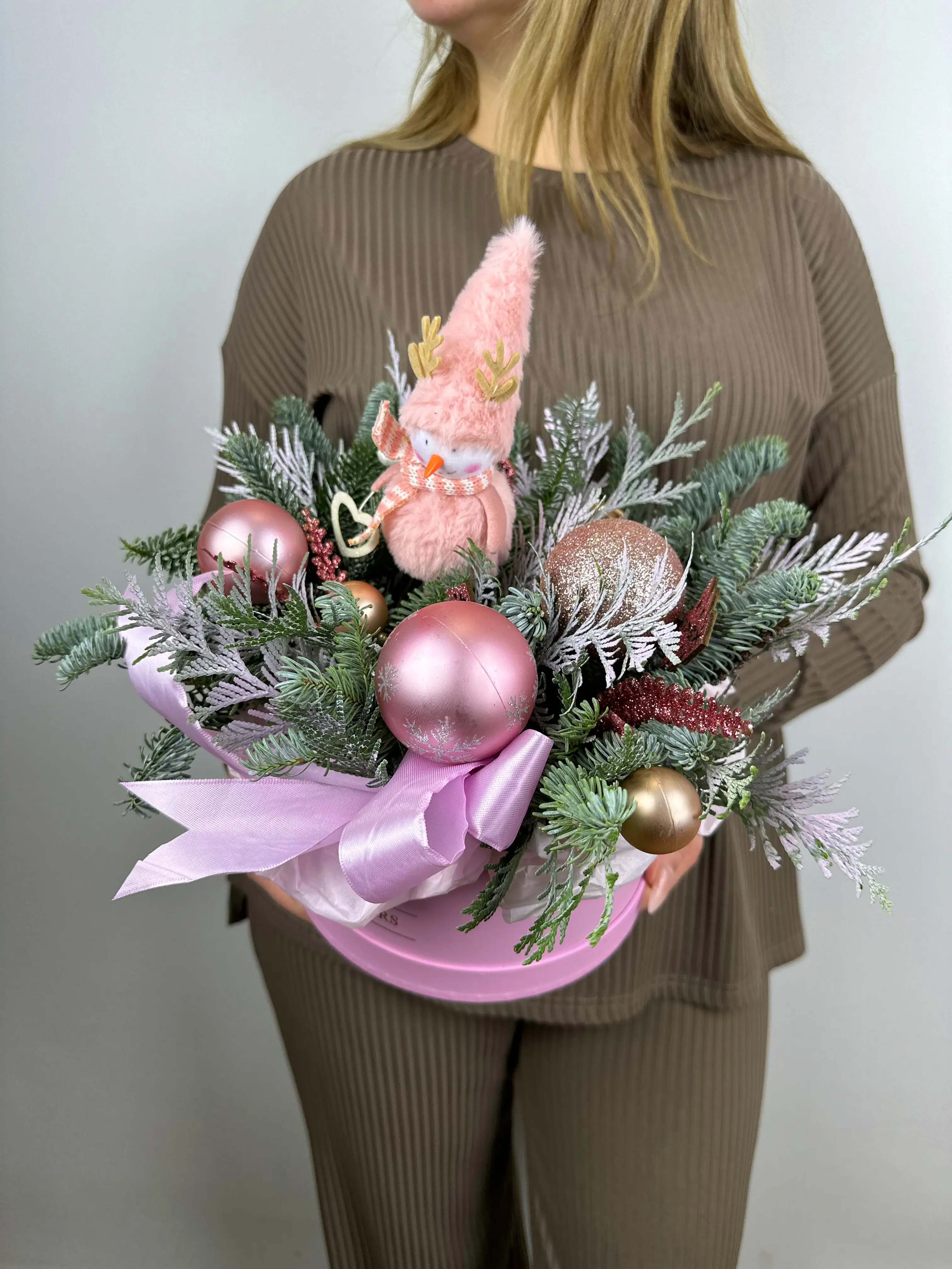 Цветы живые, Новогодняя композиция с нобилисом и снеговиком в шляпной коробке