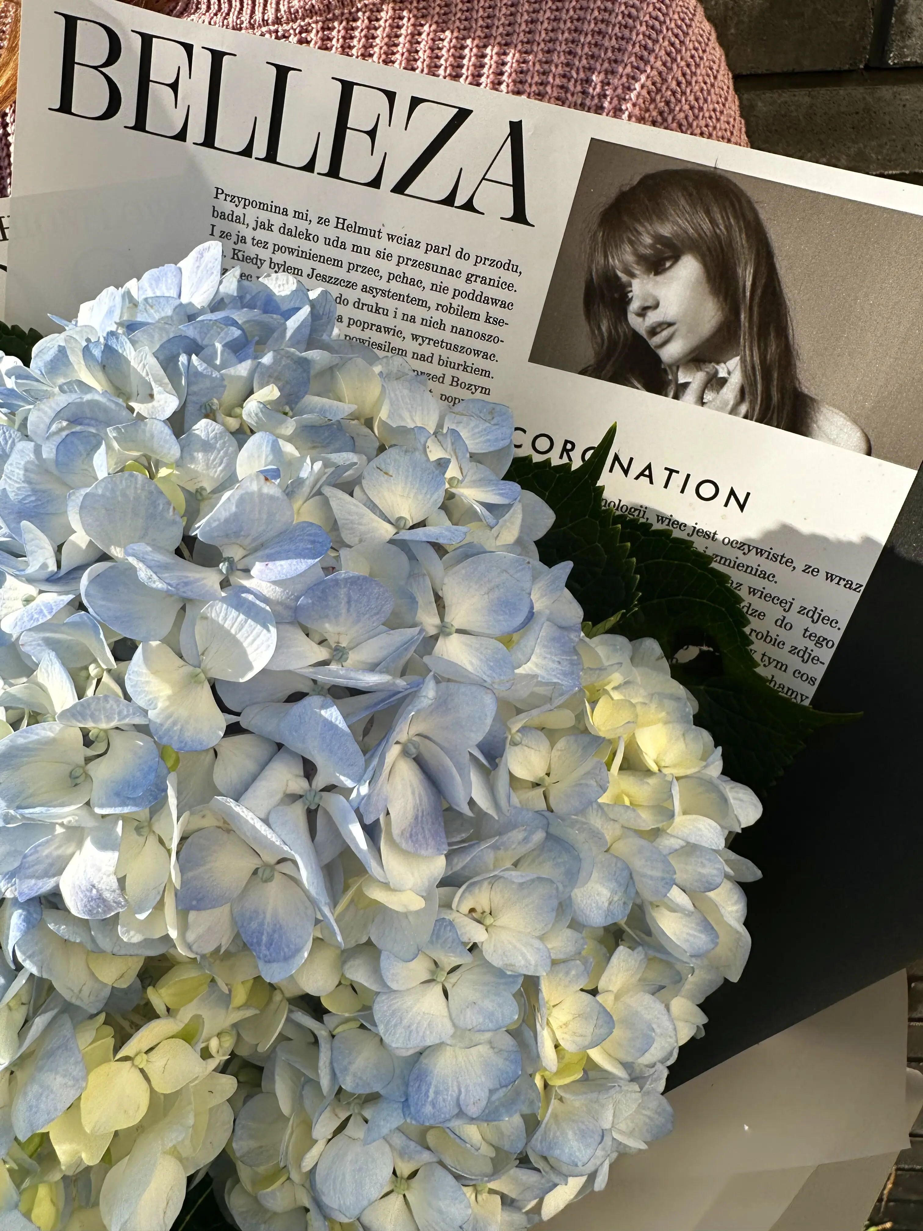 Букет живых цветов из 3 голубых гортензий в дизайнерской упаковке